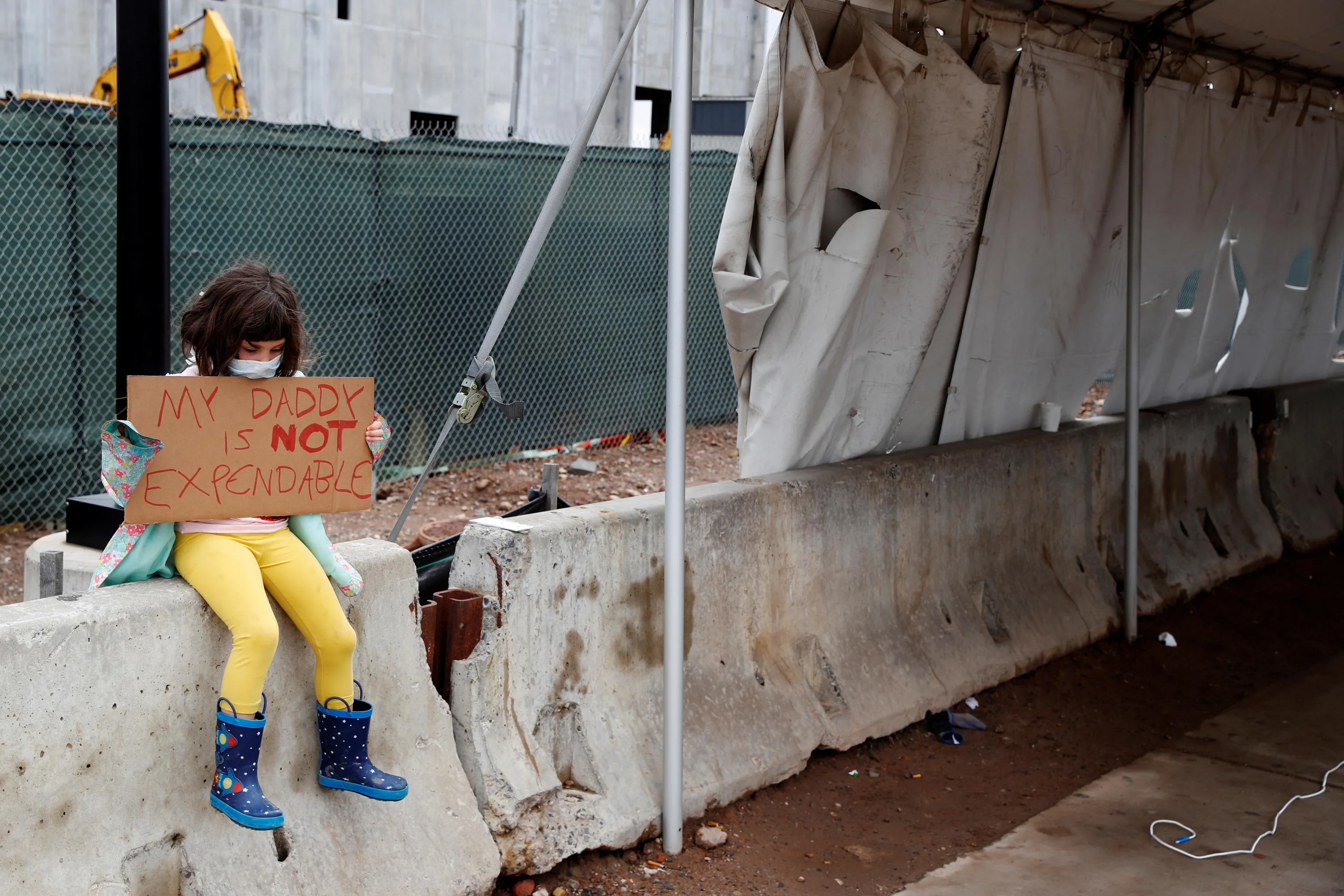 Adria Rosenberg holds a sign as she joins her mother during a protest outside an Amazon warehouse, as the spread of the coronavirus disease (COVID-19) continues, in the Staten Island borough of New York City, U.S., May 1, 2020. (Photo by Lucas Jackson/Reuters)