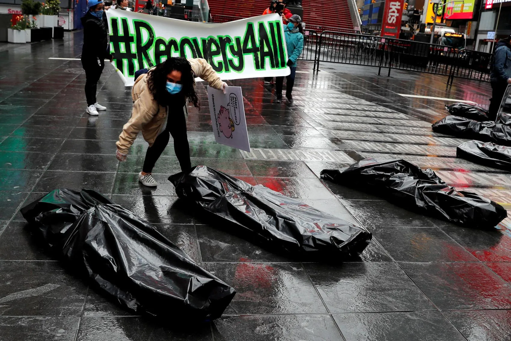 Demonstrators arrange props staged as body bags representing the death and despair in immigrant worker and essential worker communities during May Day protests in Manhattan, following the outbreak of the coronavirus disease (COVID-19) in New York City, New York, U.S., May 1, 2020. (Photo by Mike Segar/Reuters)