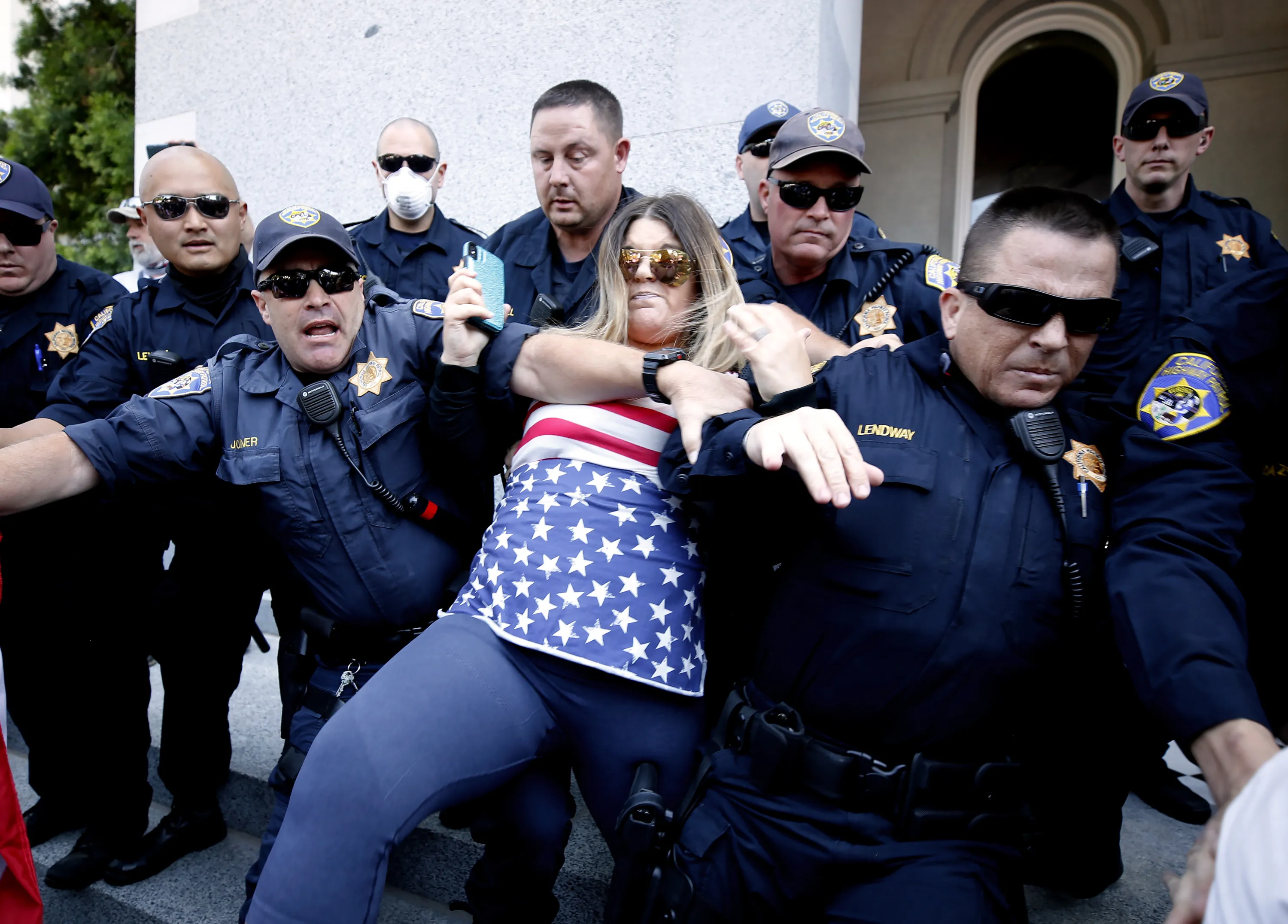 A protester is detained by California Highway Patrol officers during a demonstration against Gov. Gavin Newsom's stay-at-home orders due to the coronavirus pandemic, at the Capitol in Sacramento, Calif., Friday, May 1, 2020. Several people were taken into custody during the protest calling for Newsom to ease the restrictions and allow people return to work. (Photo by Rich Pedroncelli/AP Photo)