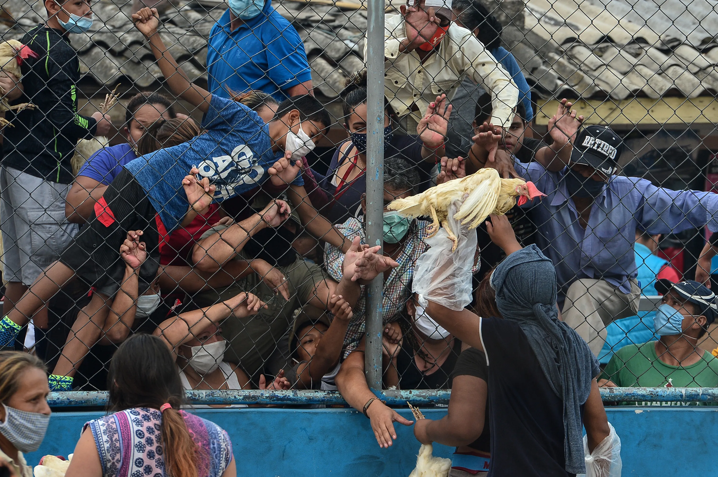 People crowd to receive hens given by Honduran presidential pre-candidate for LIBRE party, Wilfredo Mendez, at the working-class neighbourhood of El Carrizal, in Tegucigalpa on May 7, 2020, amid the new coronavirus pandemic. (Photo by Orlando Sierra/AFP Photo)