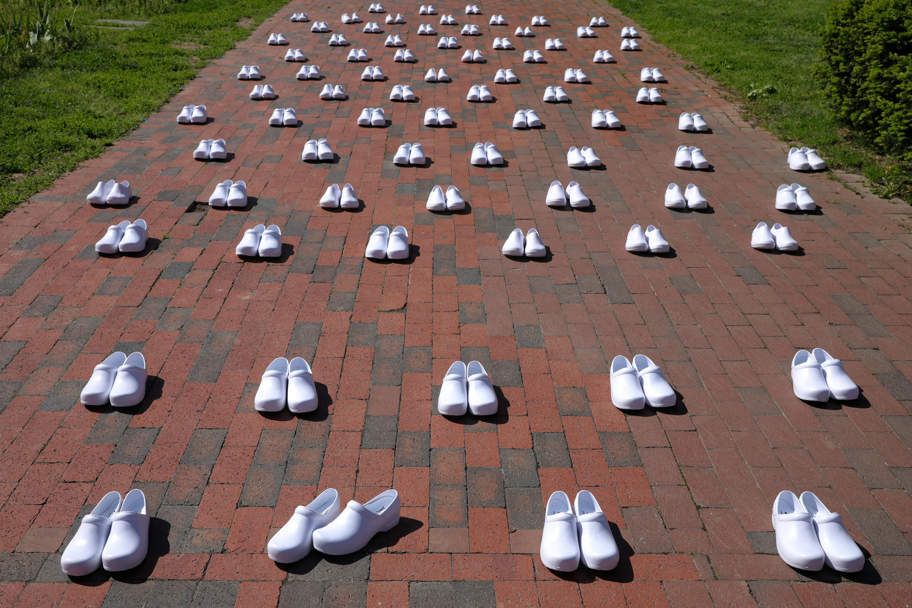 White shoes are displayed during a demonstration by Registered Nurses and the National Nurses United (NNU) members, on behalf of healthcare workers nationwide who have passed away due to the coronavirus, during a protest outside the White House in Washington, May 7, 2020. At least 90,000 health-care workers worldwide are believed to have been infected with COVID-19, and possibly twice that, amid reports of continuing shortages of protective equipment, the International Council of Nurses said on May 6. The disease has killed more than 260 nurses, it said in a statement, urging authorities to keep more accurate records to help prevent the virus from spreading among staff and patients. (Photo by Tom Brenner/Reuters)