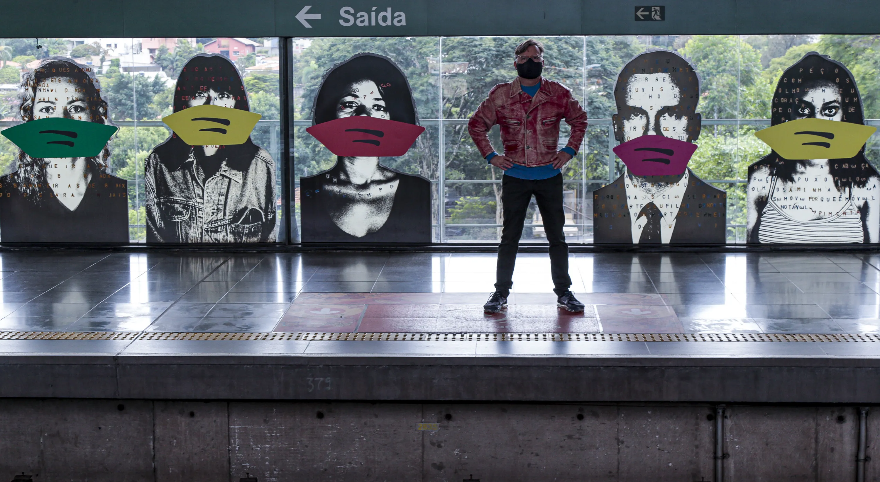 The artist Alex Flemming poses for his intervention about the use of face mask in front of a subway amidst the Coronavirus (COVID–19) pandemic on May 7, 2020 in Sao Paulo, Brazil. The Government of the State of São Paulo has decreed the mandatory use of face masks in the streets. (Photo by Miguel Schincariol/Getty Images)