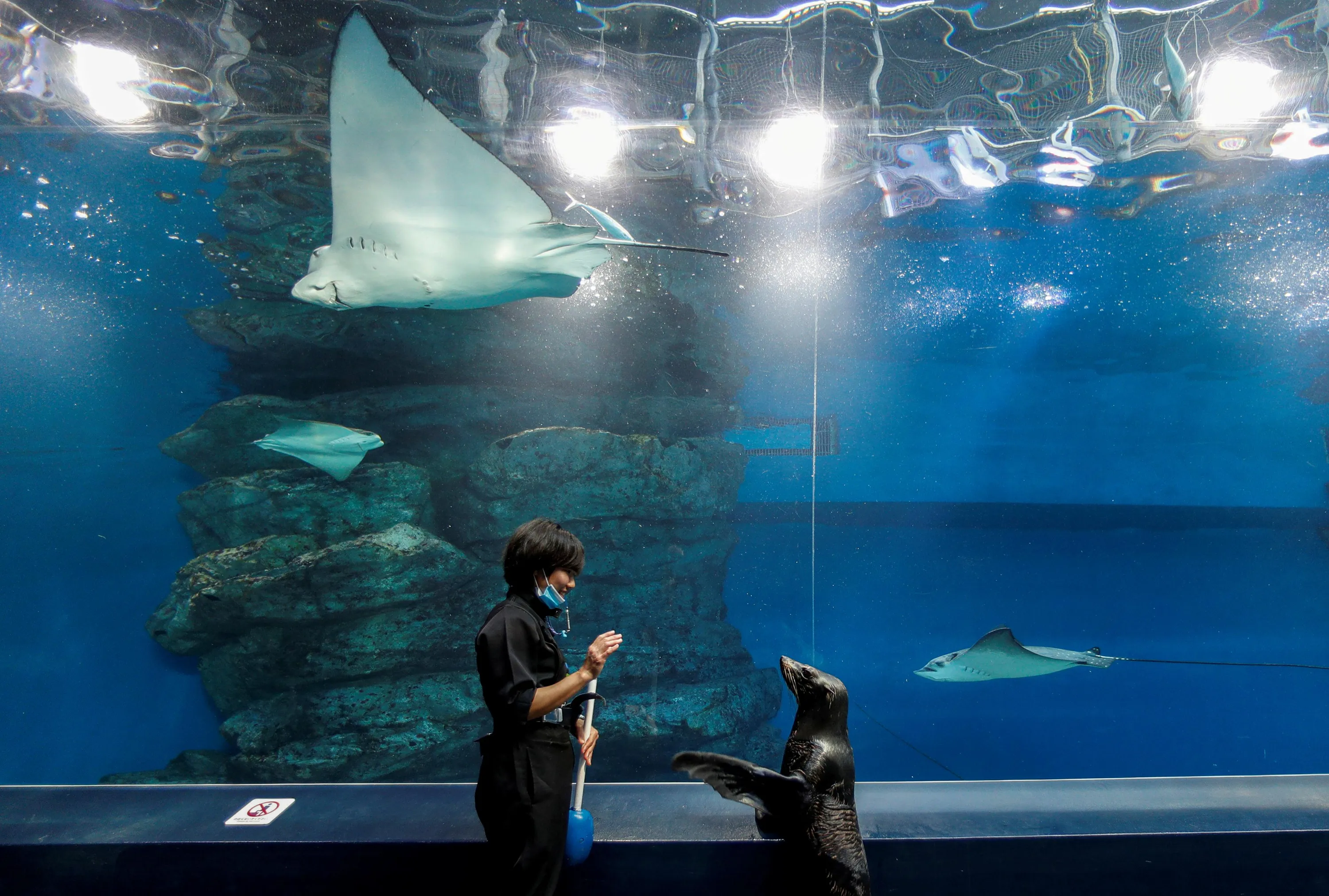 A female seal Shakitto and the aquarium keeper Manami Suka stroll together as a part of their practice for their show at an empty visitors' area at the Aqua Park Shinagawa which is closed to the public amid the coronavirus disease (COVID-19) outbreak in Tokyo, Japan on April 30, 2020. (Photo by Issei Kato/Reuters)