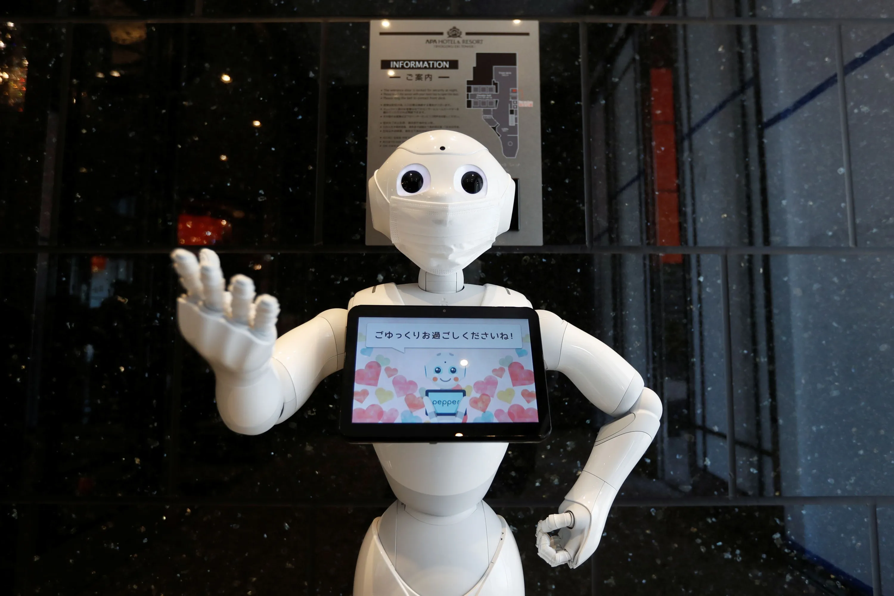 A Pepper humanoid robot, manufactured by SoftBank Group Corp. demonstrates how to check-in in a hotel of APA Group that has been designated to accommodate asymptomatic people and those with light symptoms of the coronavirus disease (COVID-19) to free up hospital beds and alleviate work by nurses and staff members, in Tokyo, Japan May 1, 2020. (Photo by Issei Kato/Reuters)