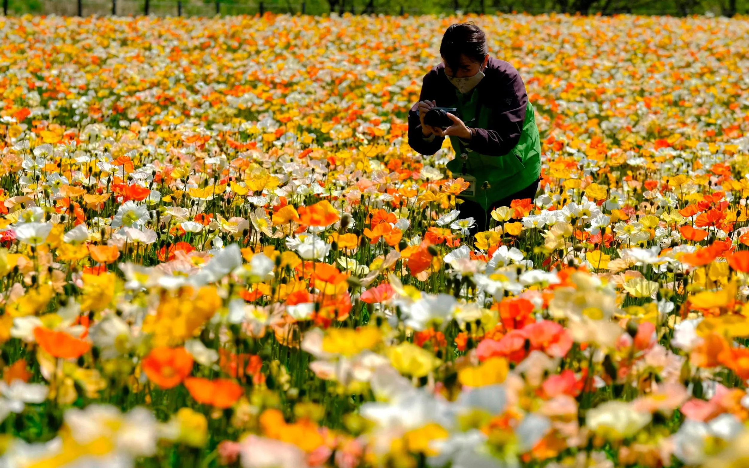 A park staff takes pictures of Iceland poppies to inform visitors on the flowering situation on their website at the Musashi-Kyuryo National Park, which has been temporarily closed since April 8 to prevent the spread of the COVID-19 coronavirus, in Namegawa, Saitama prefecture on April 26, 2020. (Photo by Kazuhiro Nogi/AFP Photo)