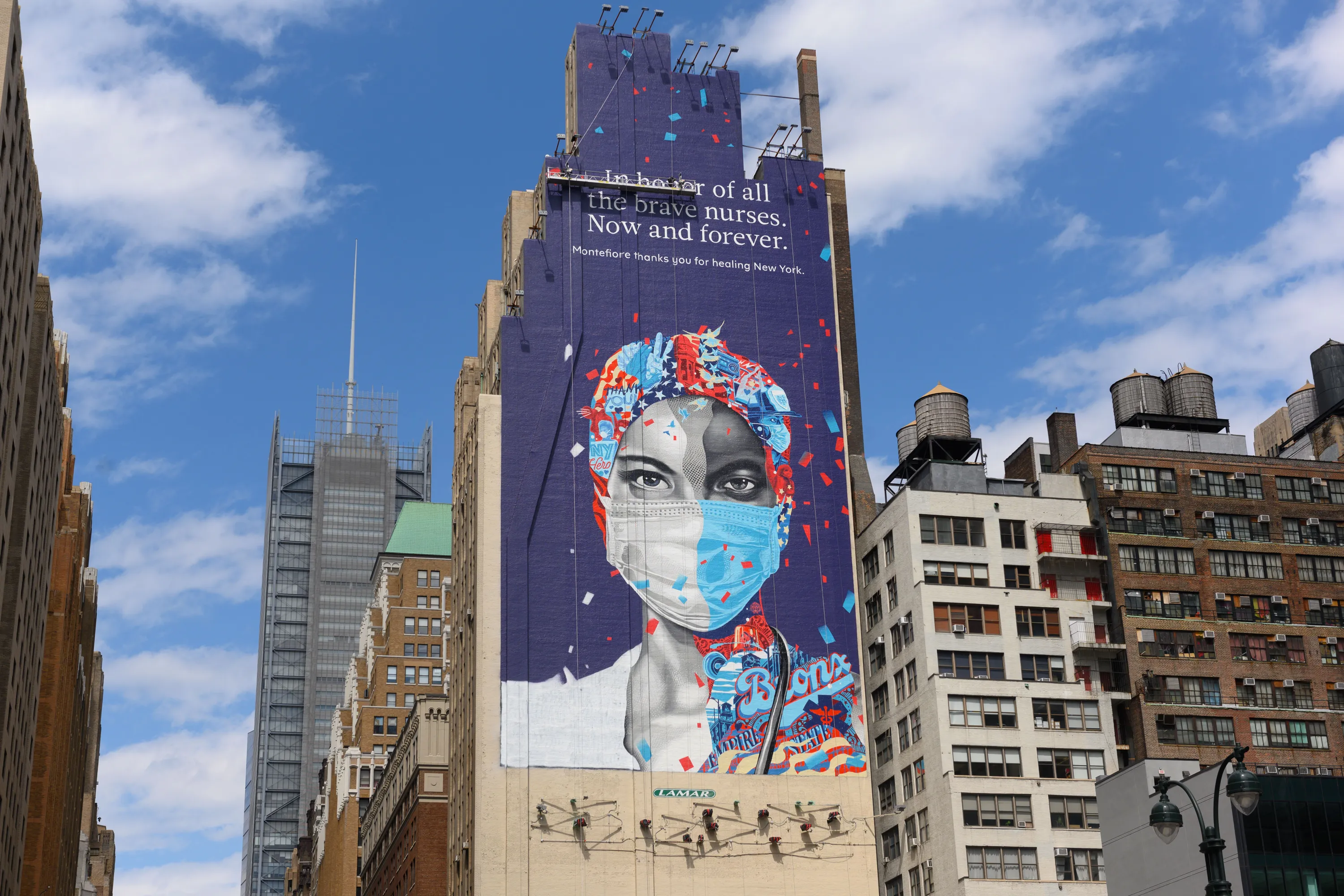 A mural dedicated to nurses is painted on the side of a building on 34th Street and Eighth Avenue in Midtown Manhattan, New York on May 4, 2020. (Photo by Erik Pendzich/Rex Features/Shutterstock)