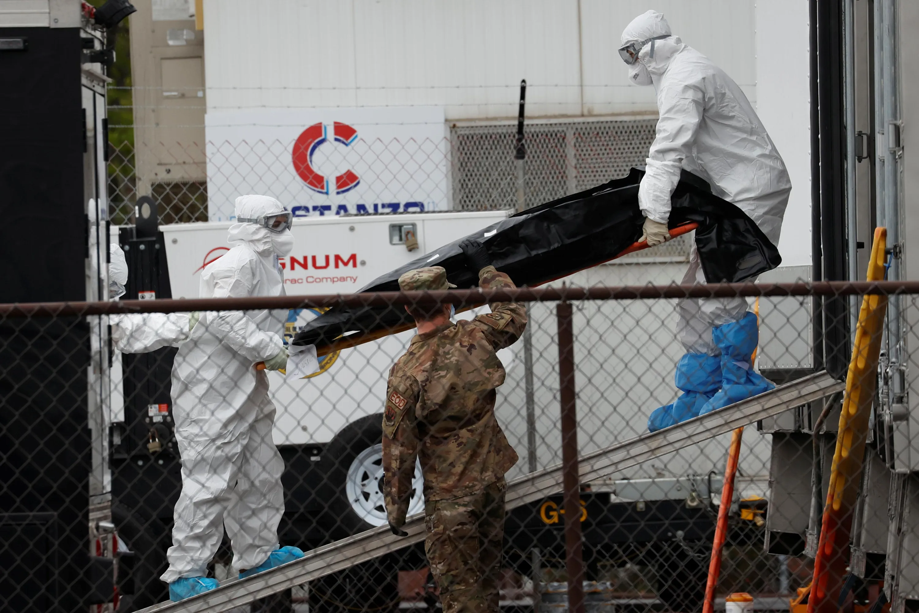 Workers wearing personal protective equipment (PPE) move the body of a deceased person from a refrigerated truck trailer set up at a temporary morgue outside University Hospital during the outbreak of the coronavirus disease (COVID-19) in Newark, New Jersey, U.S., May 6, 2020. (Photo by Mike Segar/Reuters)