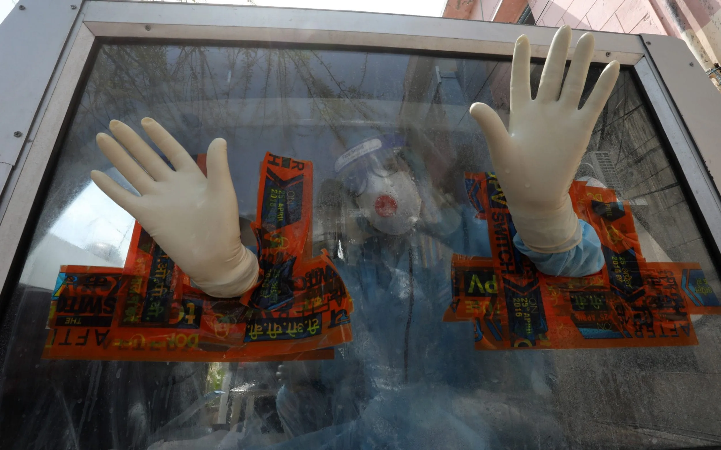 A Medical staff member sitting inside a Mobile Covid-19 Testing van gets his protective gloves sanitized as he collects swab samples for testing at red zone area of Jammu, India, 11 May 2020. According to the news reports, 25 new coronavirus positive cases were reported on 11 May. The Indian government announced lockdown extension for two weeks until 17 May, with new relaxation action plan for Red, Orange and Green Zones but people still seeking clarity from local authorities as the third phase of the countrywide lockdown begins to stem the widespread of the SARS-CoV-2 coronavirus. (Photo by Jaipal Singh/EPA/EFE/Rex Features/Shutterstock)