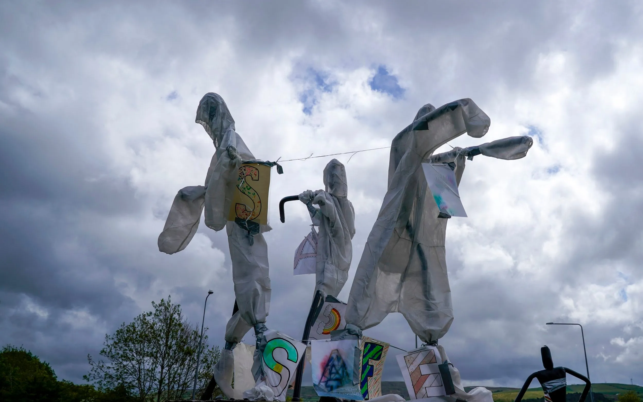 A statue entitled “The Workers” which is covered in personal protection equipment (PPE), is erected on a traffic island during the pandemic lockdown on May 11, 2020 in Haslingden, United Kingdom. The Prime Minister announced the general contours of a phased exit from the current lockdown, adopted nearly two months ago in an effort curb the spread of Covid-19. (Photo by Christopher Furlong/Getty Images)