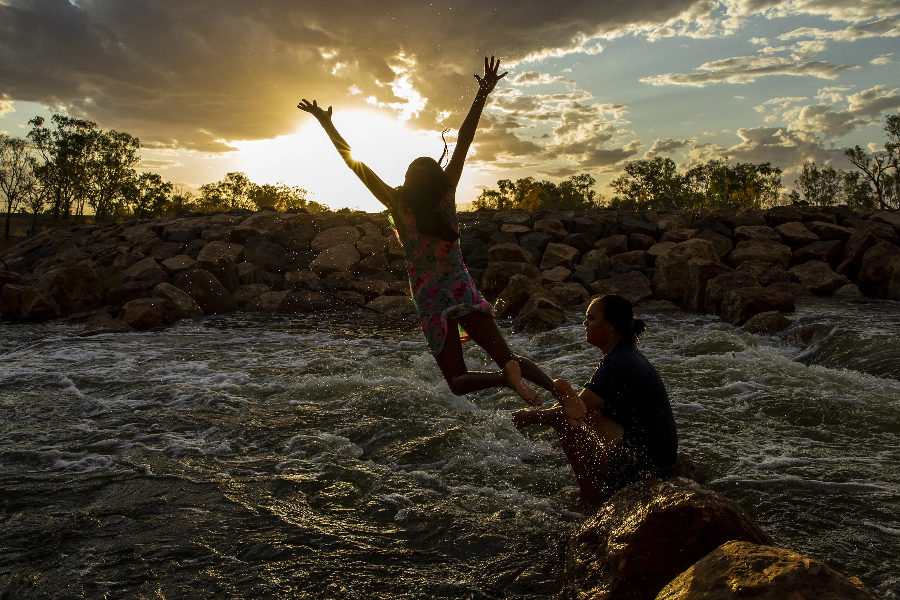 A girl is seen jumping from rocks at Brewarrina Weir on February 16, 2020 in Brewarrina, Australia. The Brewarrina Weir in Northern New South Wales overflowed on the weekend for the first time in years, as rain water from upstream flowed into the once dry river beds. The influx of water at the weir has also brought back to life the heritage listed Aboriginal fish traps, also known as Baiame's Ngunnhu. Recent rains and thunderstorms across Eastern Australia have seen a number of rivers feeding the Murray-Darling basin begin to flow. Pumping embargoes for the Barwon-Darling river system which prevent irrigators from extracting water from the river are currently in place, however there are fears that recent rainfalls may cause the NSW Government to lift the ban. (Photo by Jenny Evans/Getty Images)