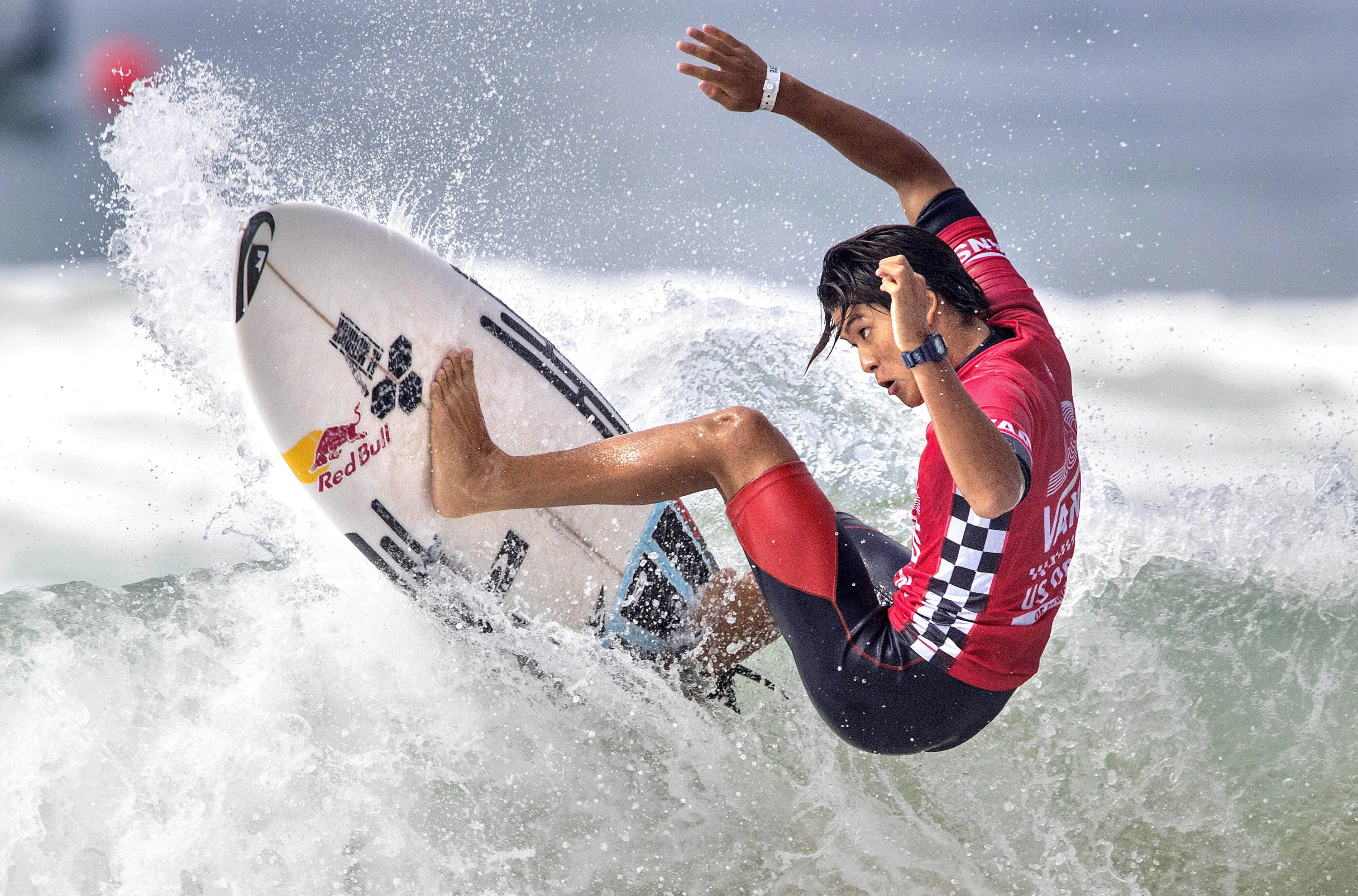 This August 4, 2017, file photo shows Kanoa Igarashi, of Huntington Beach, Calif., surfing in his heat at the U.S. Open of Surfing in Huntington Beach, Calif. His father grew up surfing in Japan before moving to Huntington Beach, to be in the heart of surf country. The 22-year-old Igarashi has dual citizenship and elected to compete for Japan where's already a household name and been featured in a reality TV show. (Photo by Mark Rightmire/The Orange County Register via AP Photo)