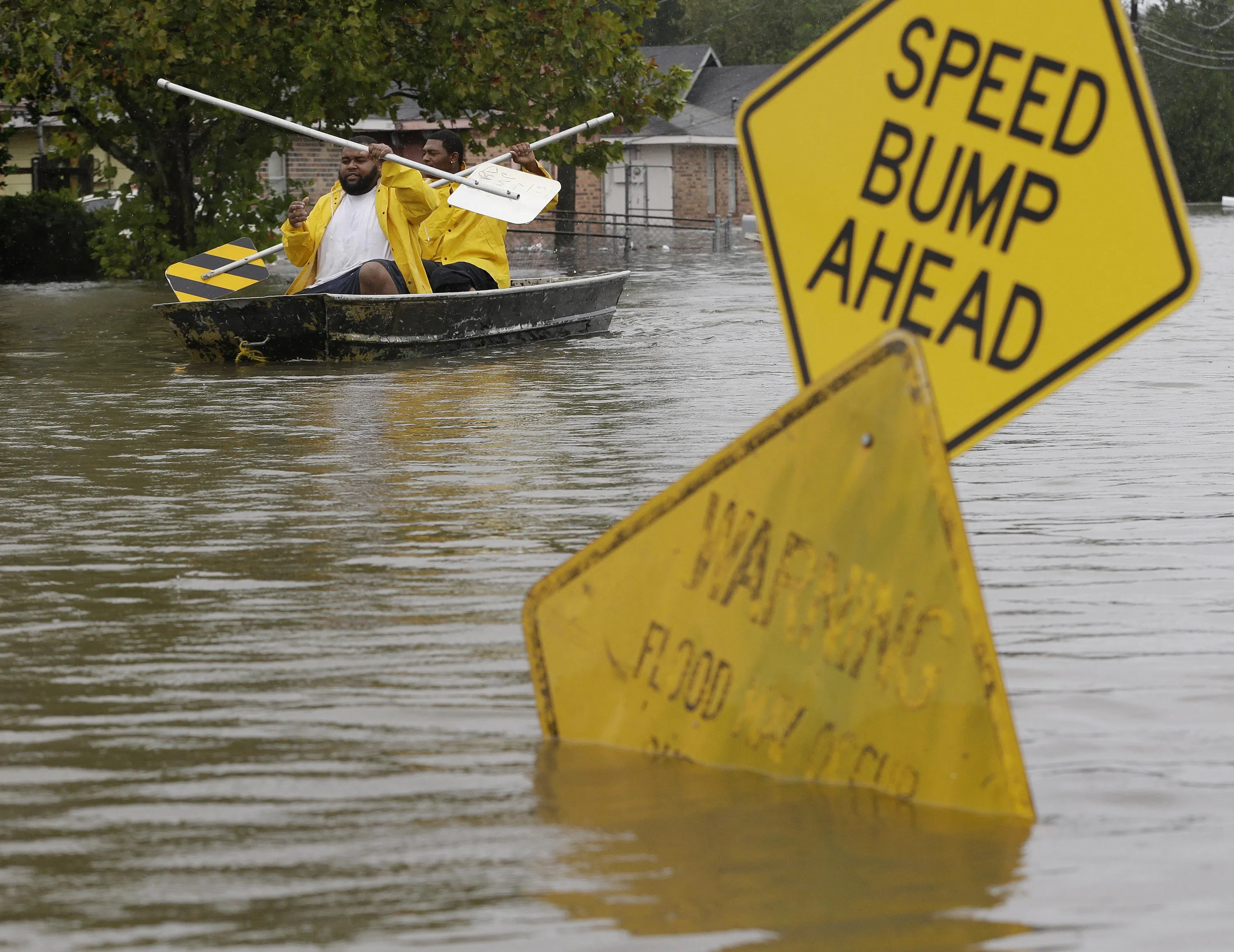 Isaac Fields and Victor Jones use street signs to paddle out of their flooded neighborhood on Aug. 30 in LaPlace, La. (Photo by Eric Gay/AP)