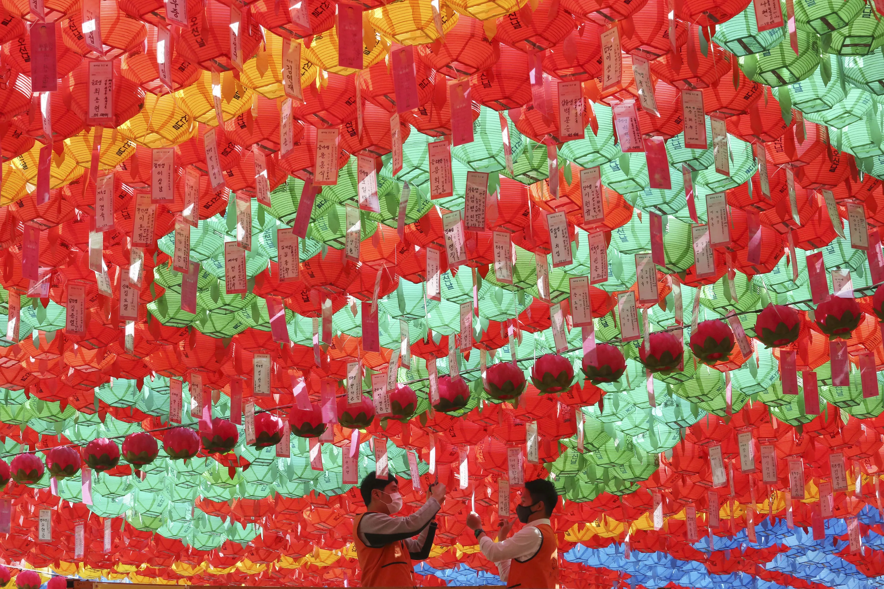 Workers wearing face masks to help protect against the spread of the new coronavirus attach name tags of Buddhists who made donation to lanterns to celebrate Buddha's birthday at the Chogyesa temple in Seoul, South Korea, Thursday, April 30, 2020. (Photo by Ahn Young-joon/AP Photo)