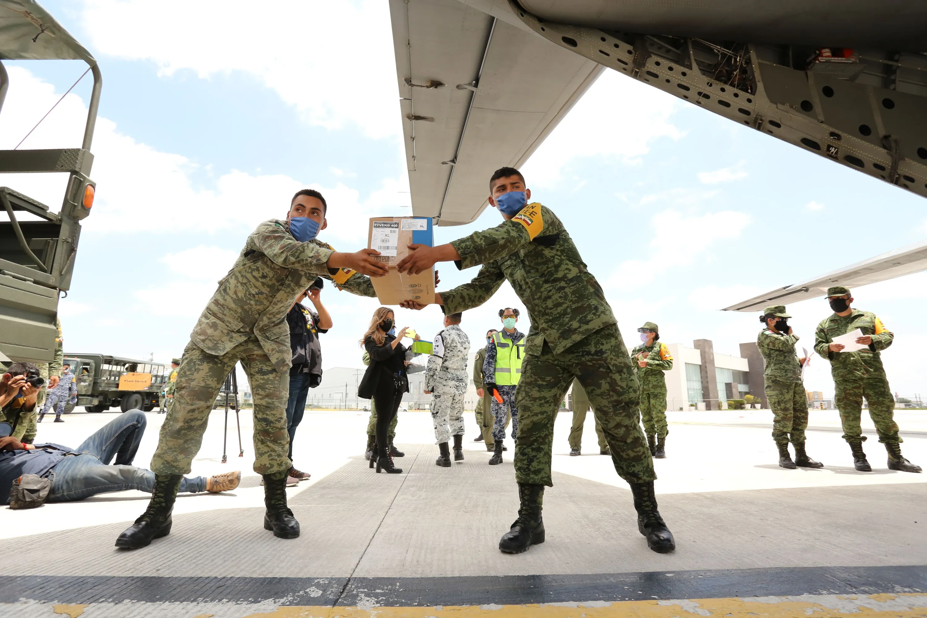 Military officers unload 5.6 tons of supplies to distribute for Insabi hospitals arrived at the Military Air Base on May 12, 2020 in Monterrey, Mexico. Non essential activities are not permitted during stage three of the nation-wide health emergency during the COVID-19 pandemic. However, no sanctions were announced and protective measures vary depending on each state. Mexico is facing the peak of contagion with COVID-19 according to Hugo Lopez-Gatell Undersecretary of Prevention and Health Promotion. Mexico City remains as the State with the higher number of cases and deceases. (Photo by Jam Media/Getty Images)