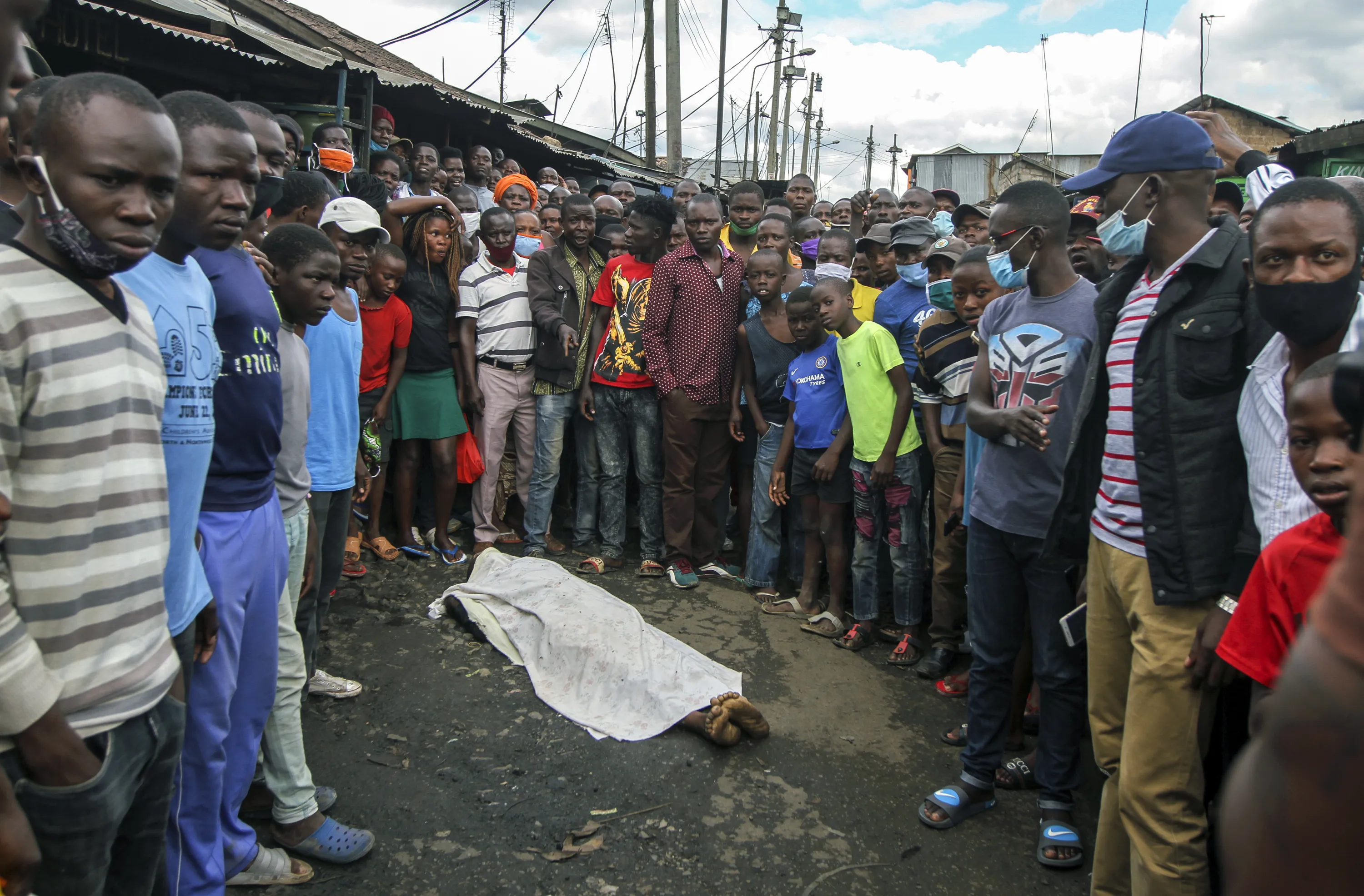 Residents gather around the covered dead body of a man, who they claimed had been beaten by police for being outside during the dusk to dawn curfew, but which could not be independently verified, in the Mathare slum, or informal settlement, of Nairobi, Kenya Monday, May 4, 2020. Human rights groups have protested the police use of excessive force to enforce the curfew put in place to curb the spread of the new coronavirus. (Photo by AP Photo/Stringer)