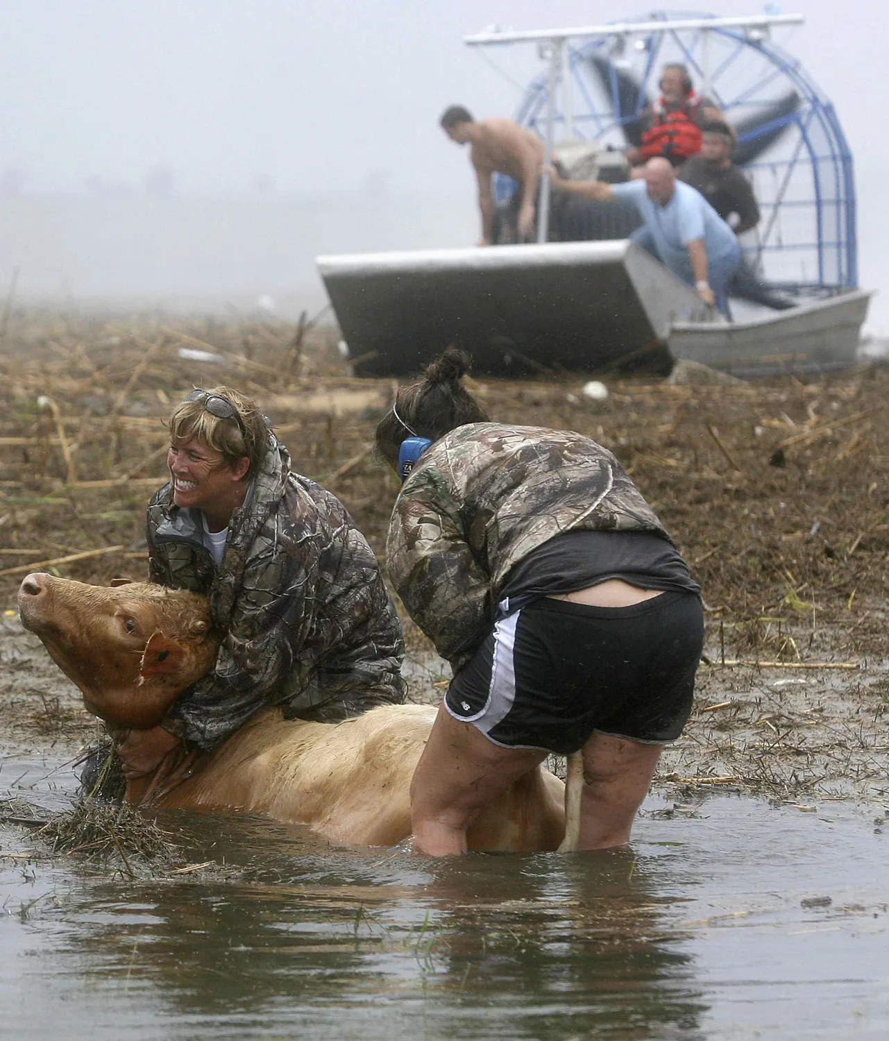 Sherry Henson and Charmin Cosse try to save a cow along Highway 23 in Louisiana's Plaquemines Parish on August 30. (Photo by Sean Gardner/Reuters)