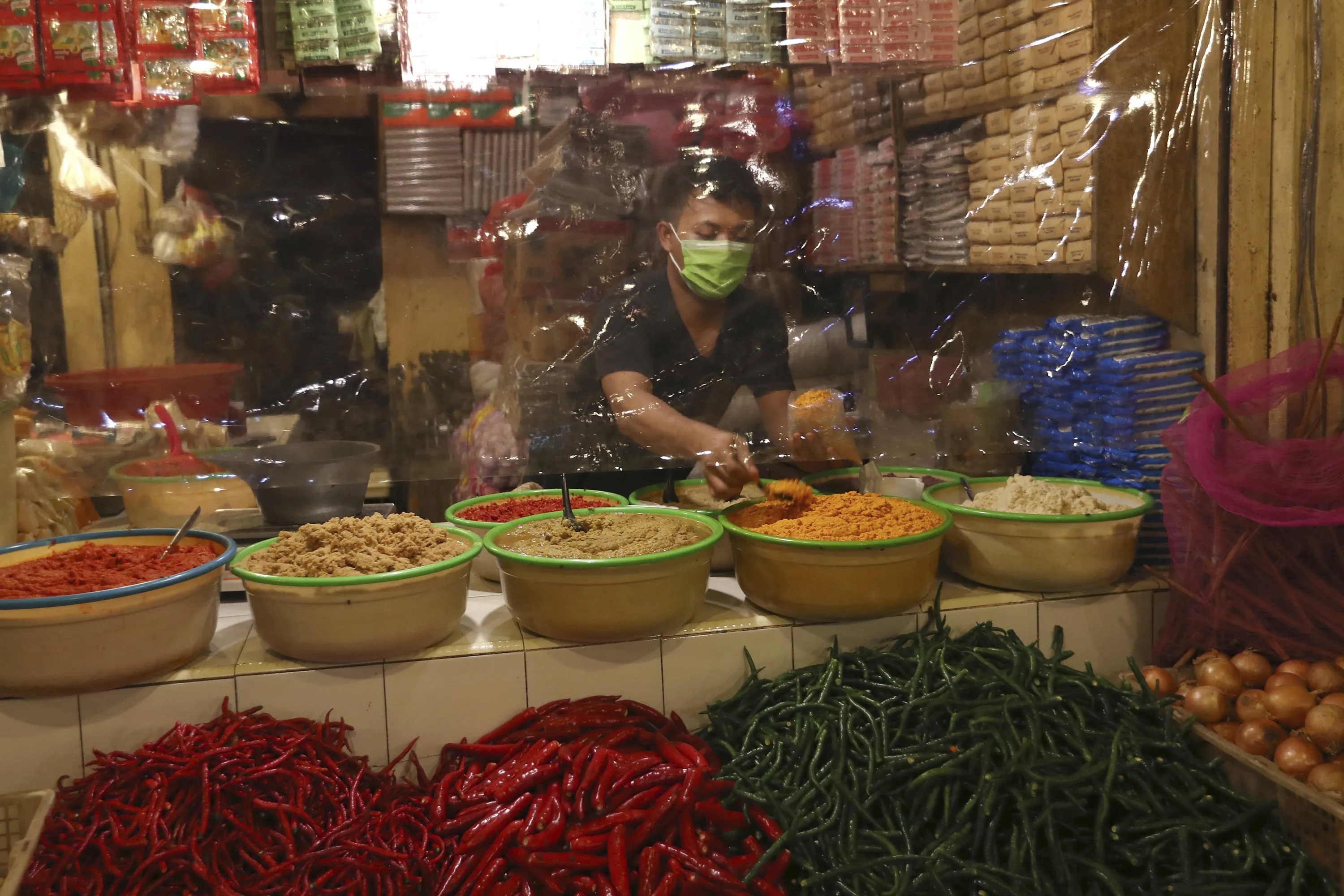 A spice vendor wearing a face mask waits for customers behind a protective plastic sheet at a traditional market in Tangerang, Indonesia, Saturday, May 9, 2020. (Photo by Tatan Syuflana/AP Photo)