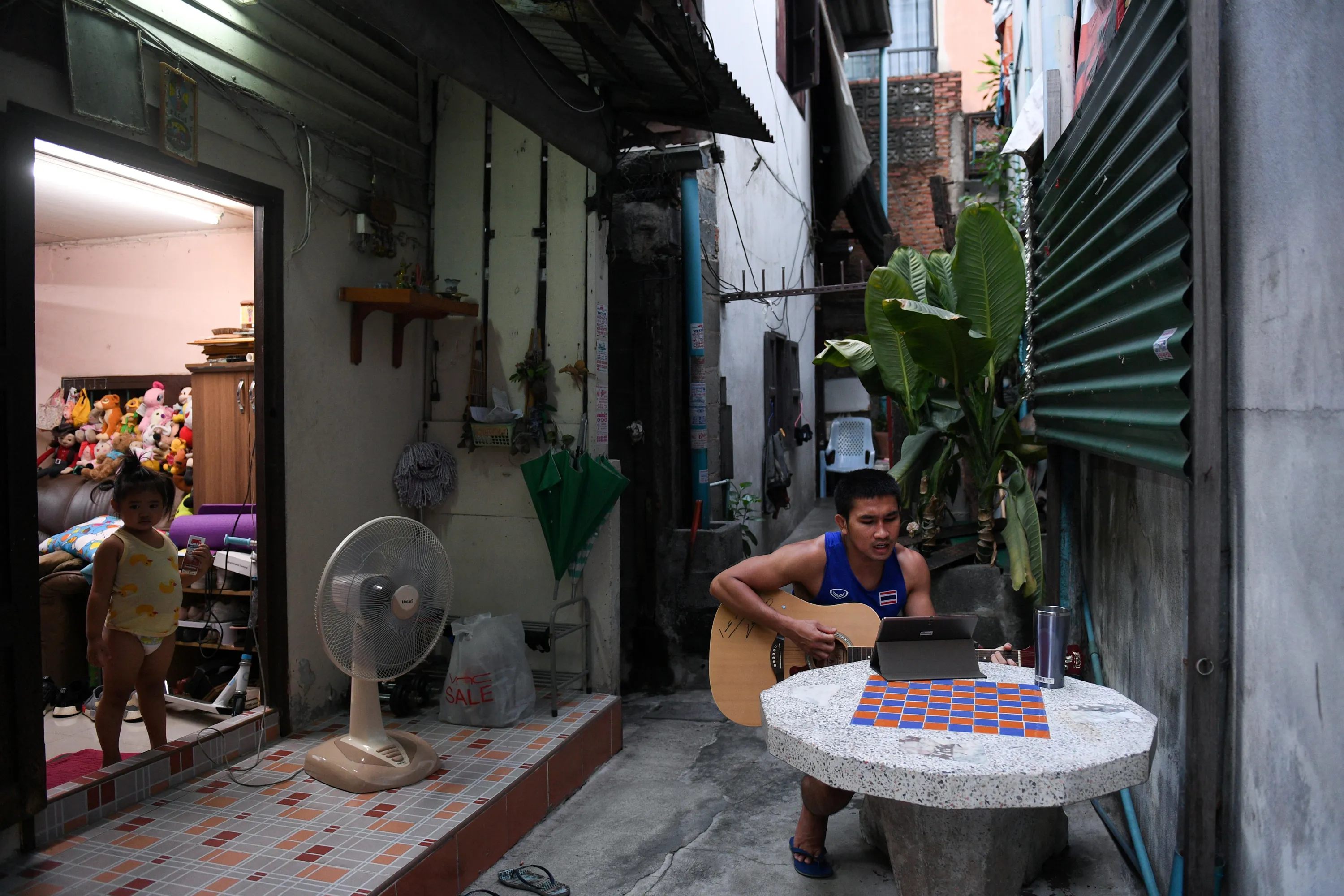 Chatchai-decha Butdee, 35, a boxer who planned to gracefully retire after the Tokyo 2020 Olympics, plays guitar at his house during the coronavirus disease (COVID-19) outbreak in Bangkok, Thailand, April 24, 2020. (Photo by Chalinee Thirasupa/Reuters)