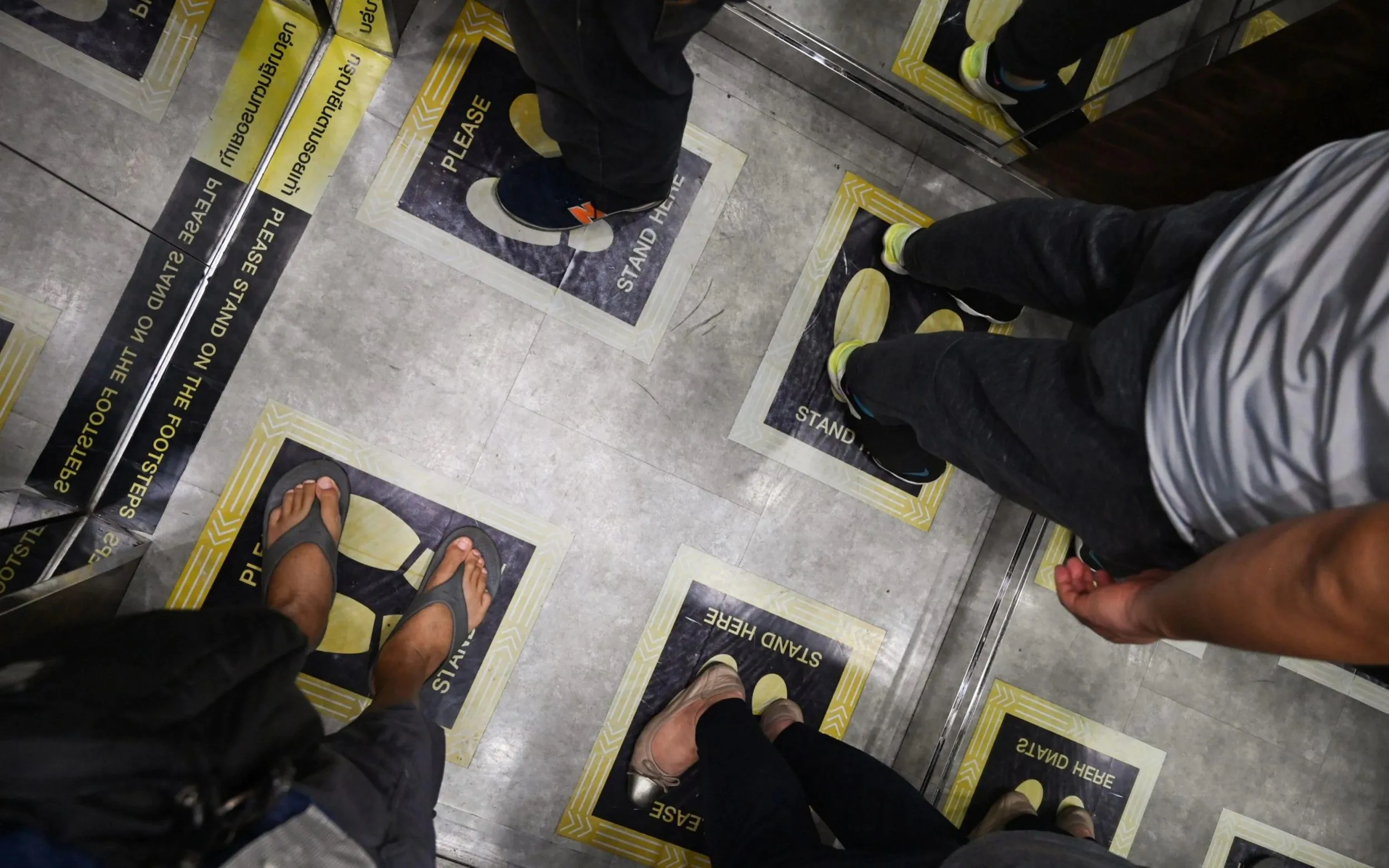 People observe social distance markers in an elevator in Bangkok on May 3, 2020, as the Thai government eased measures aimed at combating the spread of the COVID-19 novel coronavirus. Thailand began easing restrictions related to the COVID-19 novel coronavirus on May 3 by allowing various businesses to reopen, but warned that the stricter measures would be re-imposed should cases increase again. (Photo by Romeo Gacad/AFP Photo)