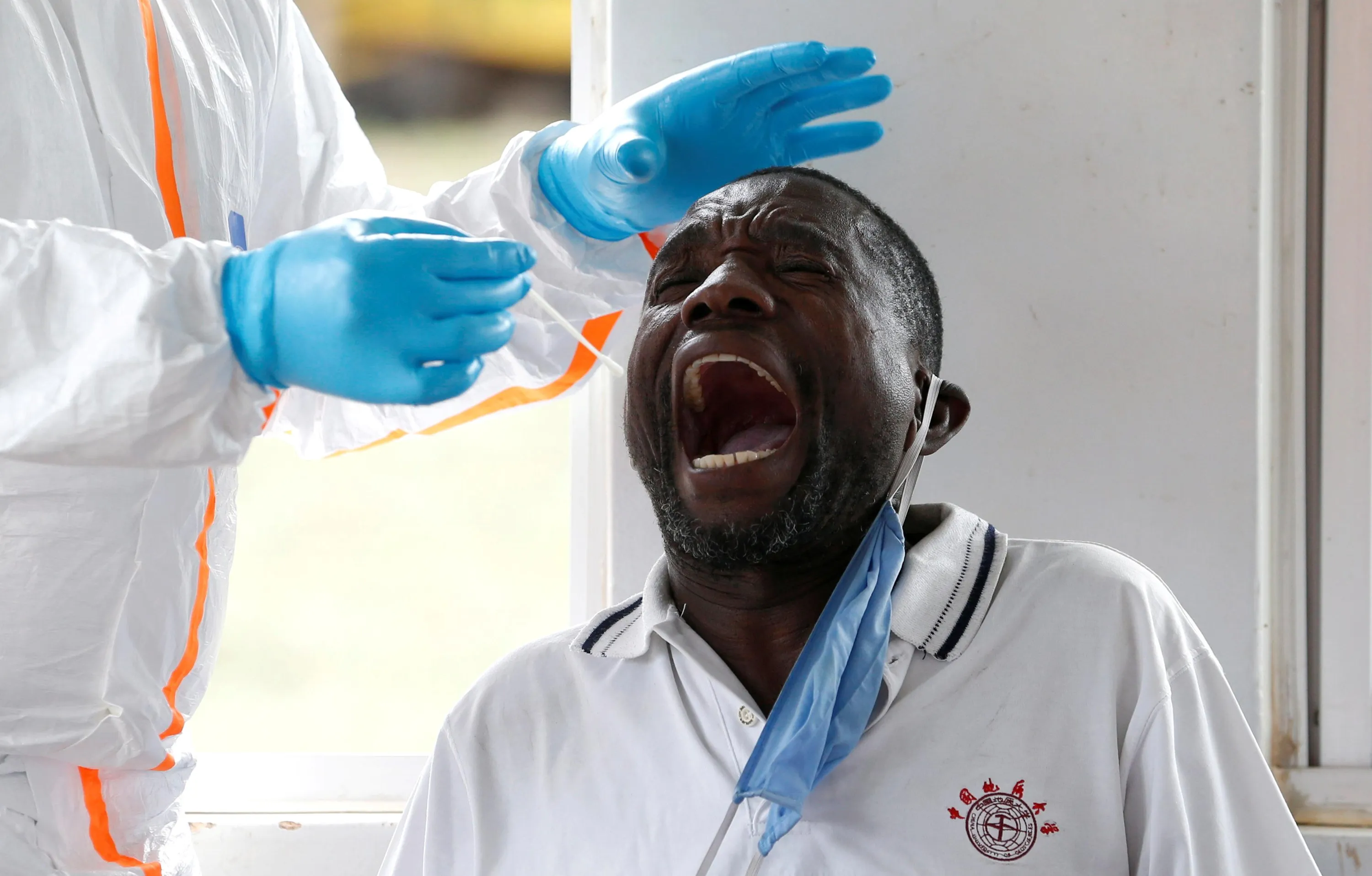 A Kenyan ministry of health medical worker takes a swab from a truck driver during a testing for the coronavirus disease (COVID-19), at the Namanga one stop border crossing point between Kenya and Tanzania, in Namanga, Kenya on May 12, 2020. (Photo by Thomas Mukoya/Reuters)