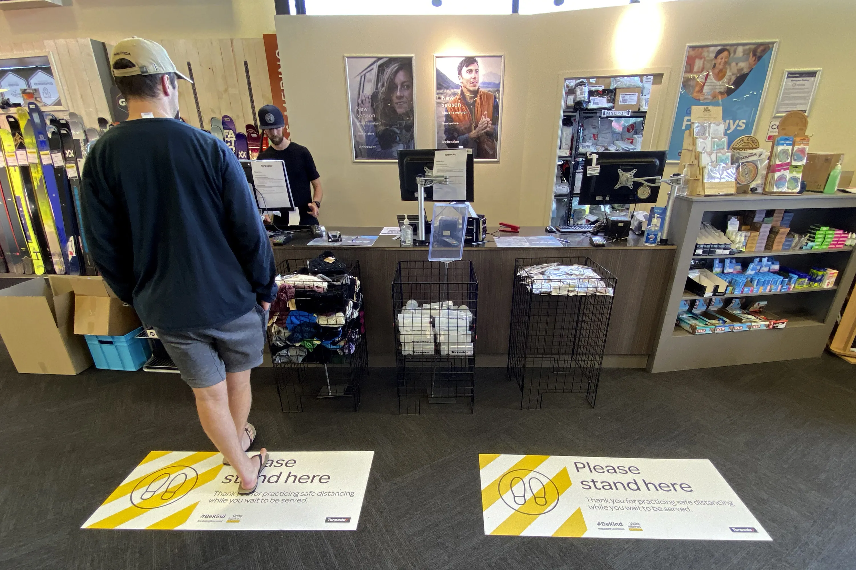 A customer waits at a counter at a shop in Christchurch, New Zealand, Thursday, May 14, 2020. New Zealand lifted most of its remaining lockdown restrictions from midnight Wednesday as the country prepares for a new normal. Malls, retail stores and restaurants are all reopening Thursday in the South Pacific nation of 5 million, and many people are returning to their workplaces. (Photo by Mark Baker/AP Photo)