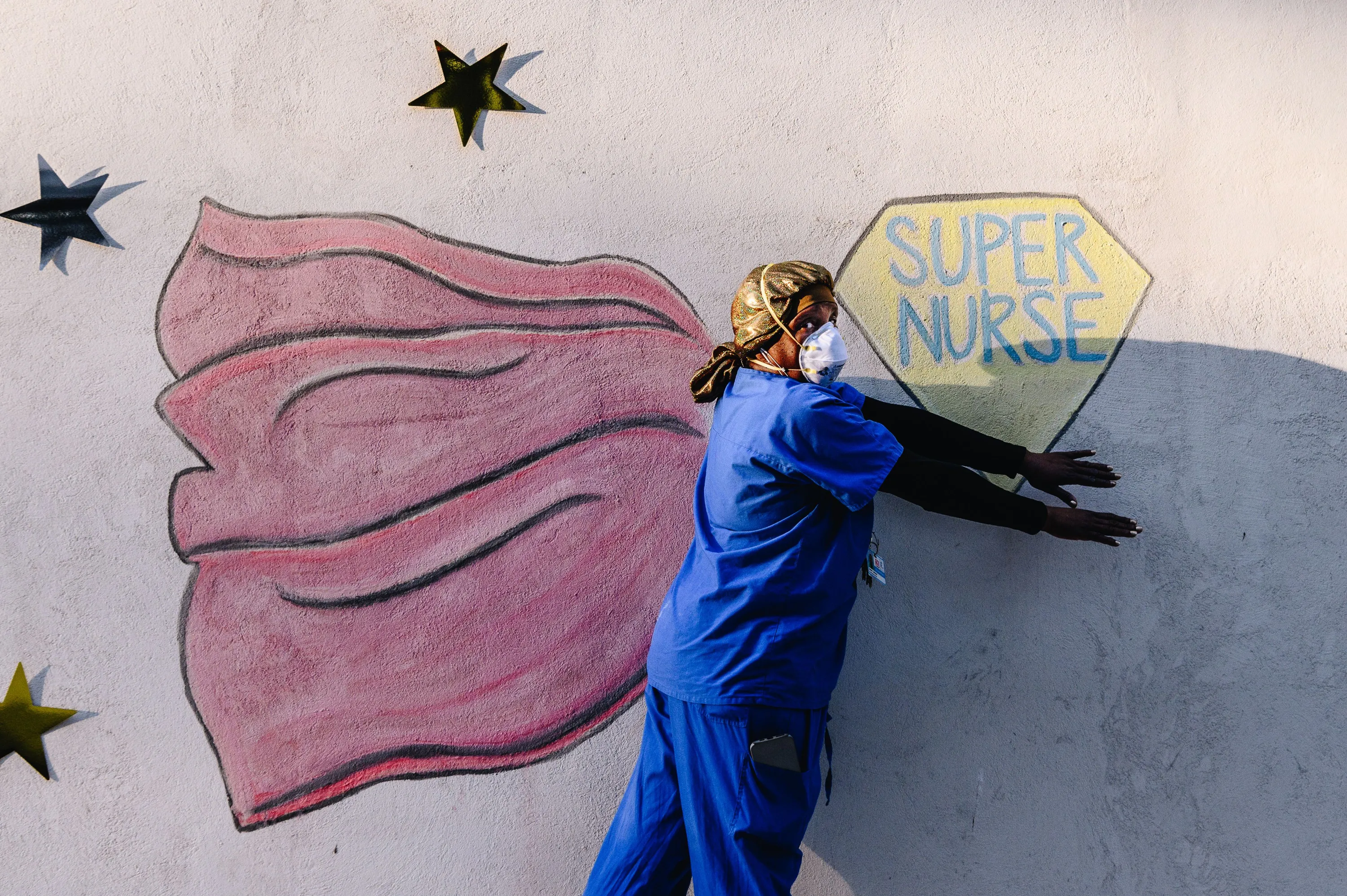 A medical worker poses in front of a chalk mural outside Mount Sinai Morningside hospital in New York on May 7, 2020 during nurses appreciation week. (Photo by Nina Westervelt/Rex Features/Shutterstock)
