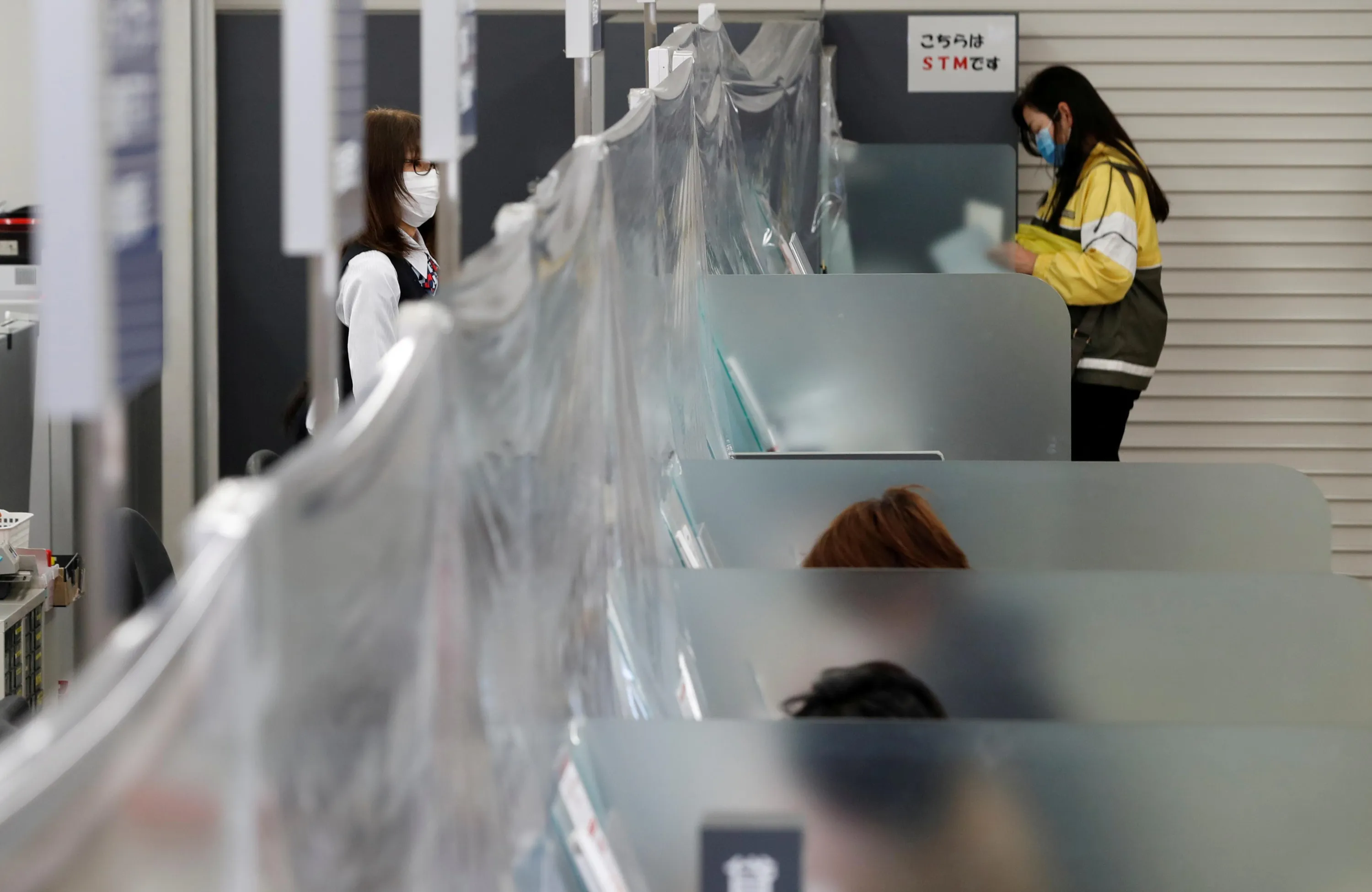 A bank teller wearing a protective face mask stands at a counter where a plastic curtain is installed in order to prevent infections following the coronavirus disease (COVID-19) outbreak, at the Higashinakano branch of MUFG Bank in Tokyo, Japan, April 24, 2020. (Photo by Kim Kyung-Hoon/Reuters)