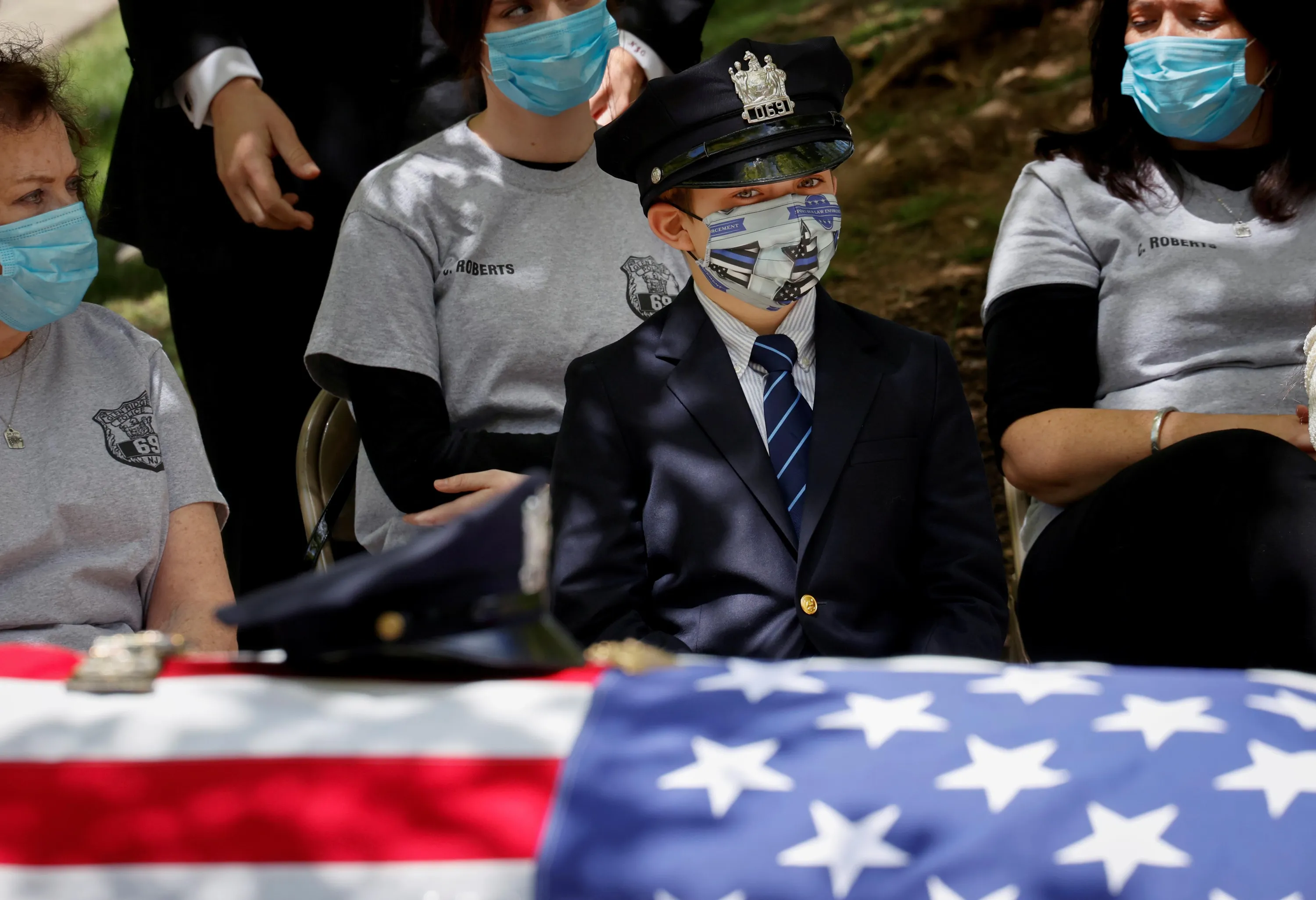 Gavin Roberts wears his father's police hat as he looks at the flag-draped casket of his father, Glen Ridge Police Department officer Charles Roberts, at his funeral service, after the 45-year-old father of three died of the coronavirus in Glen Ridge, New Jersey, May 14, 2020. (Photo by Mike Segar/Reuters)