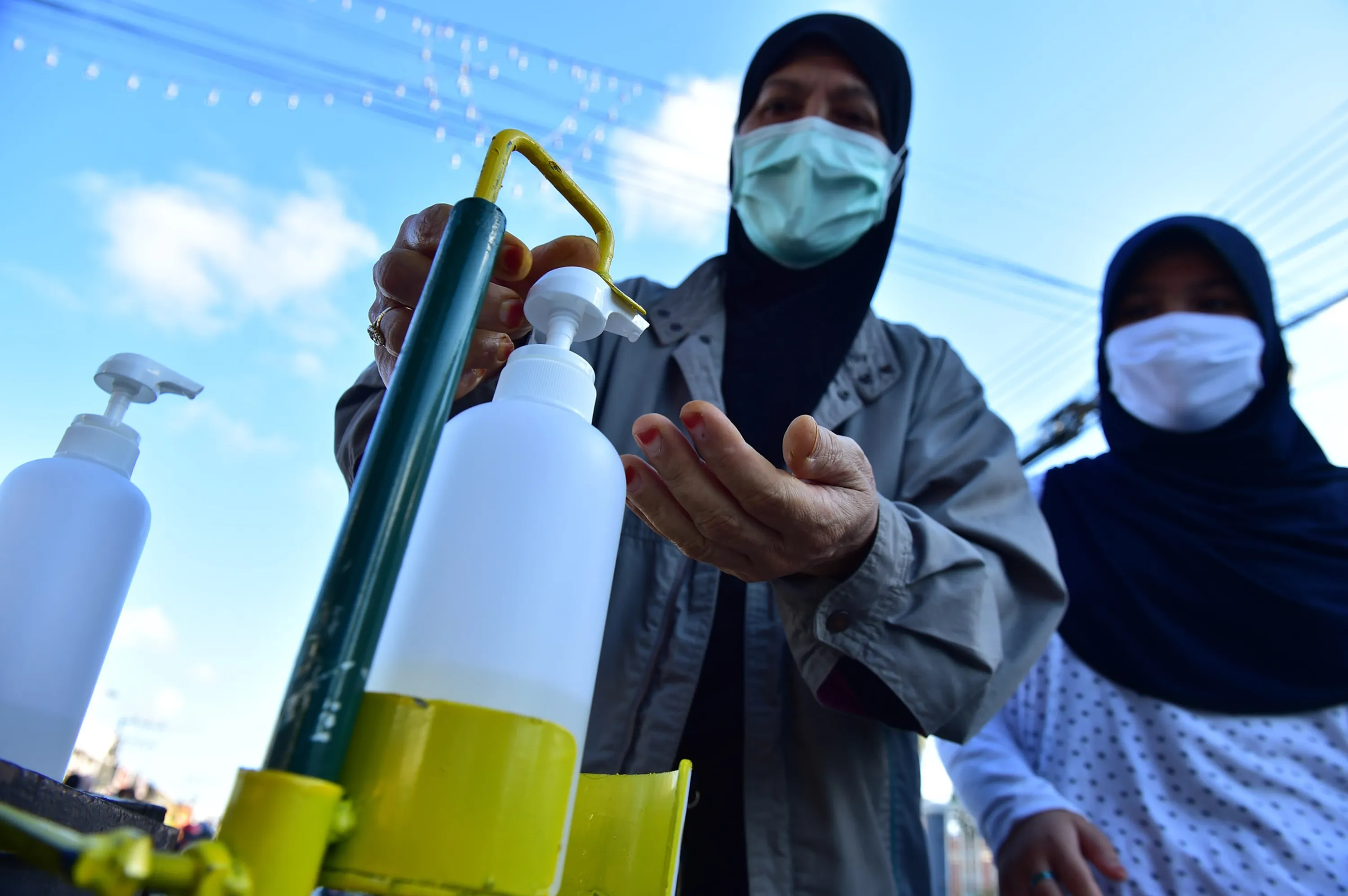 A woman wearing a face mask disinfects her hands amid concern over the spread of the COVID-19 coronavirus, before buying food in a market area ahead of breaking the fast during the Islamic holy month of Ramadan in Thailand's southern province of Narathiwat on May 5, 2020. (Photo by Madaree Tohlala/AFP Photo)