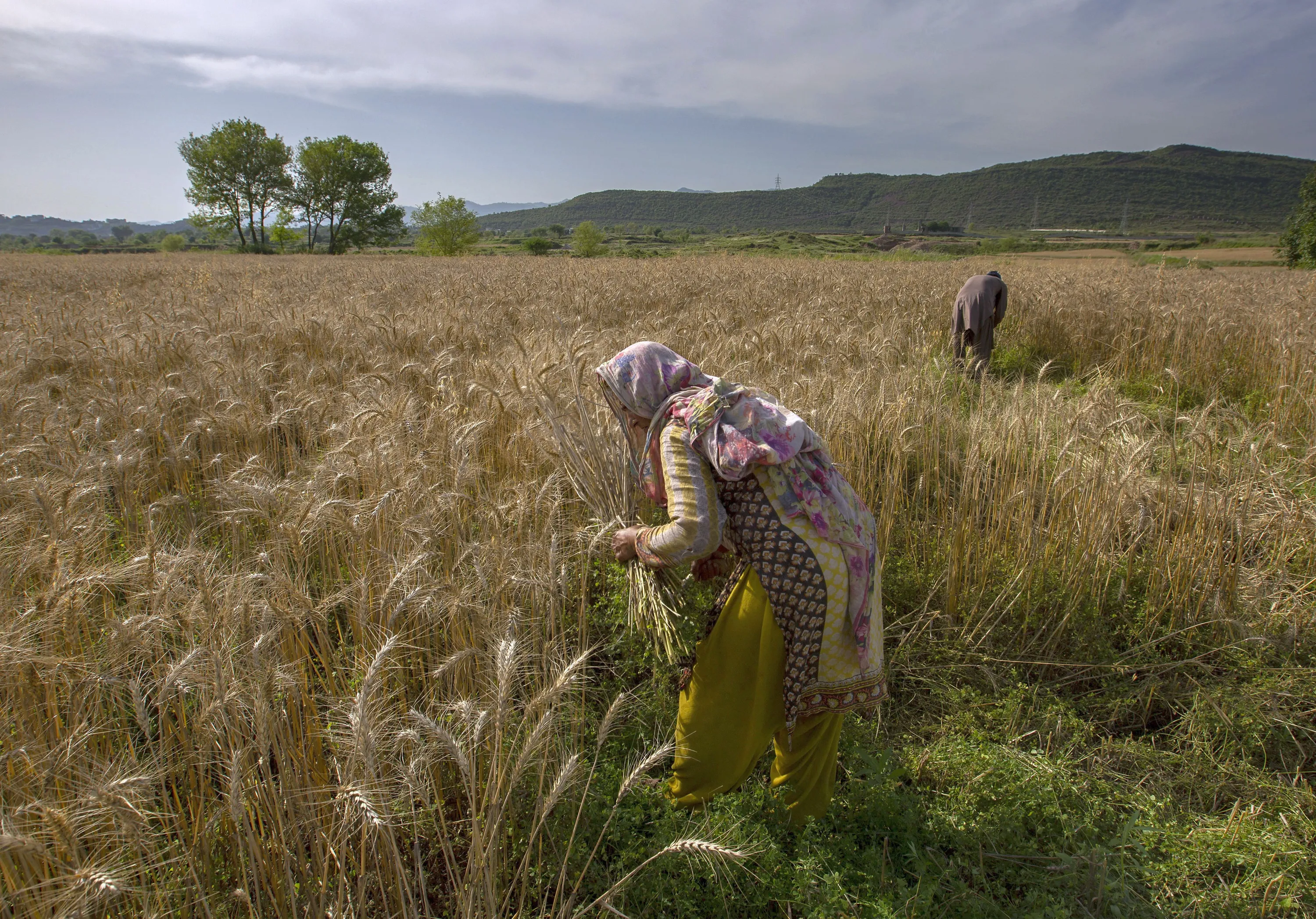 Pakistani villager Hameeda Begum harvests crop with her son due to unavailability of daily wage laborers, during a government-imposed nationwide lockdown to help contain the spread of the coronavirus, in suburbs of Islamabad, Pakistan, Thursday, April 30, 2020. (Photo by B.K. Bangash/AP Photo)