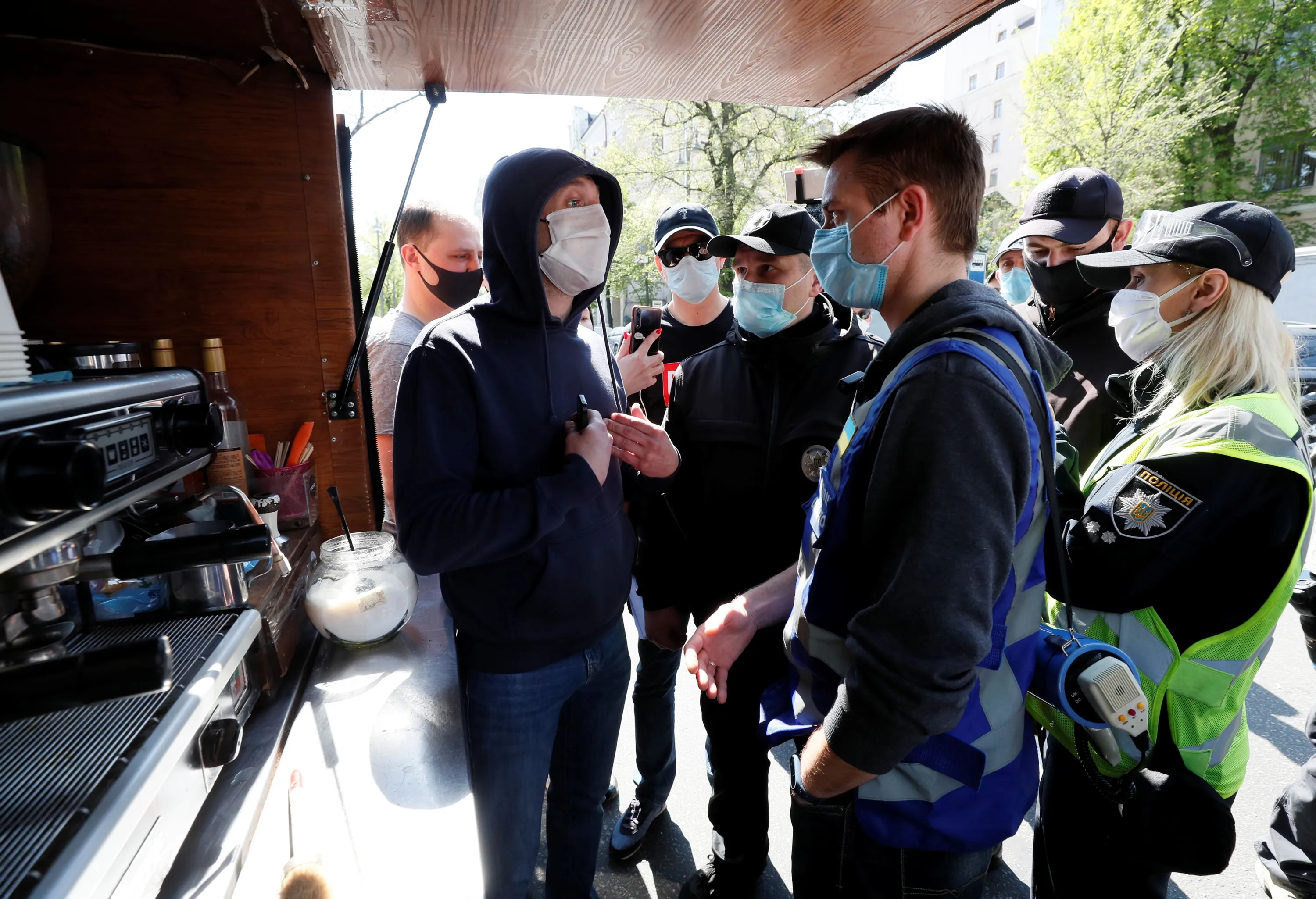 Demonstrators argue with police officers during a protest to demand support from the government for small businesses and easing of lockdown measures put into place because of the coronavirus disease (COVID-19) outbreak, in front of the Ukrainian cabinet of ministers building in central Kiev, Ukraine on April 29, 2020. (Photo by Gleb Garanich/Reuters)