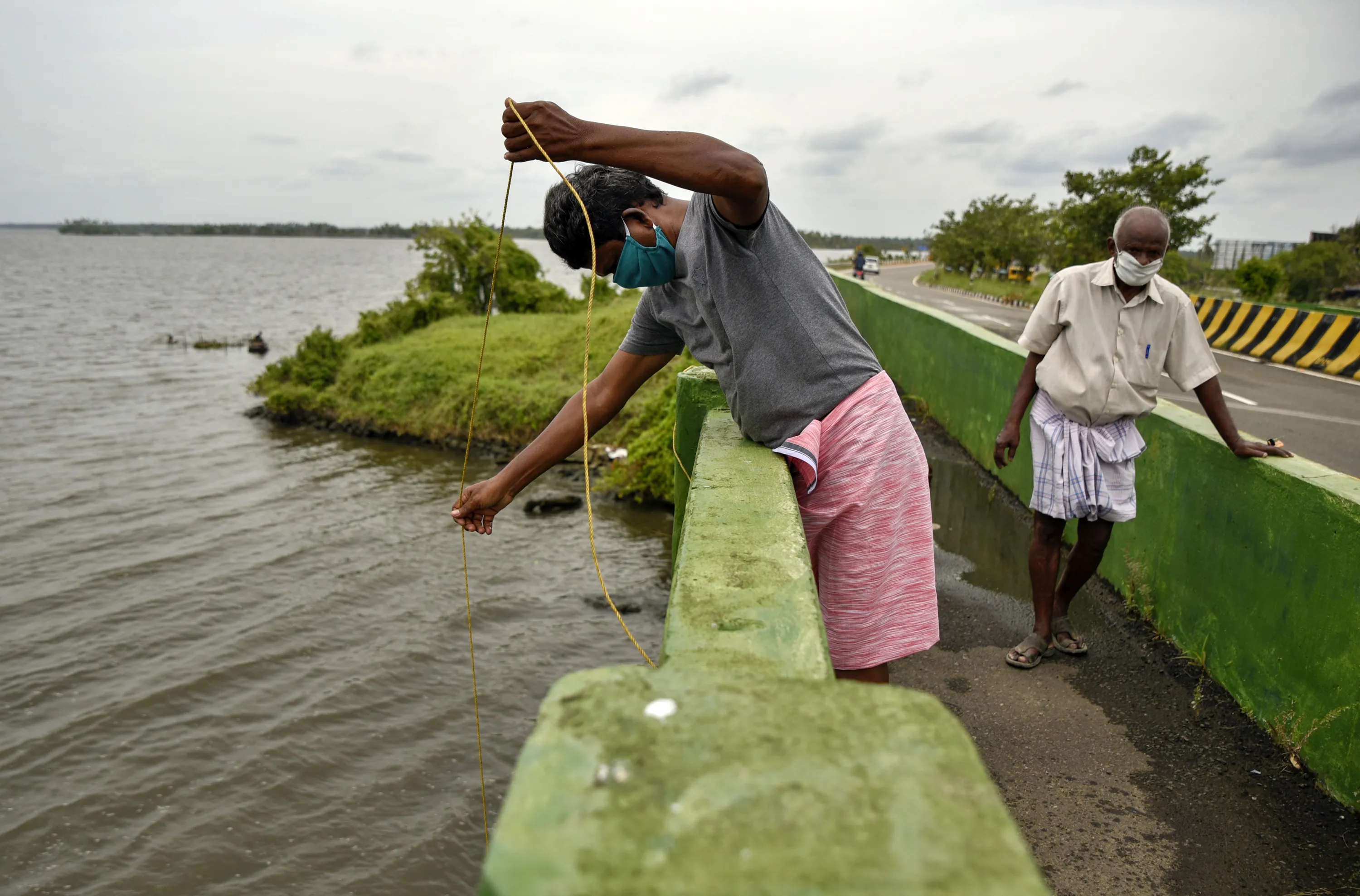 Indians wearing face masks engage in fishing during lockdown to curb the spread of coronavirus in Kochi, Kerala, India, Saturday, May 16, 2020. Prime Minister Narendra Modi's government is due to announce a decision this weekend on whether to extend the 54-day-old lockdown. (Photo by R S Iyer/AP Photo)