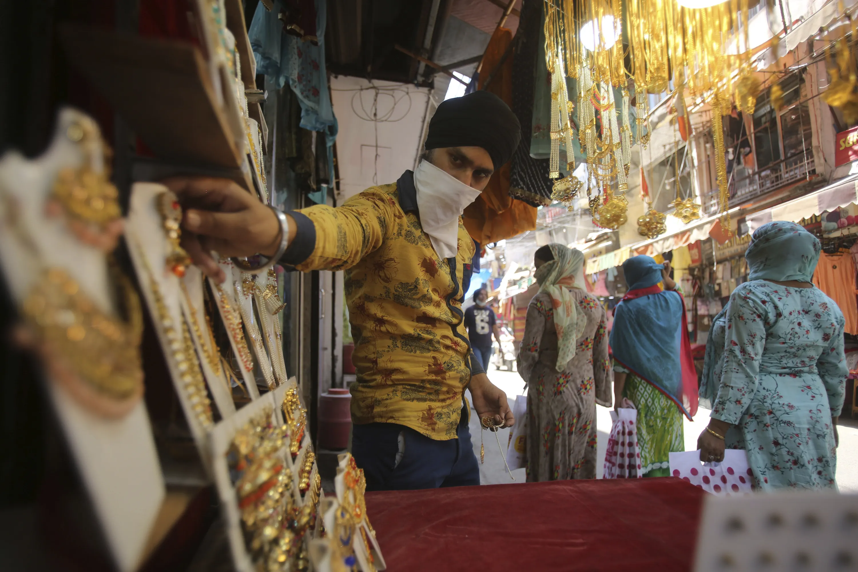 A shopkeeper displays jewelry for sale at a market area in Jammu, India, Wednesday, May 20, 2020. Small shops and other businesses were reopened in several states. E-commerce companies started to deliver goods, including those considered nonessential, to places outside containment zones. (Photo by Channi Anand/AP Photo)