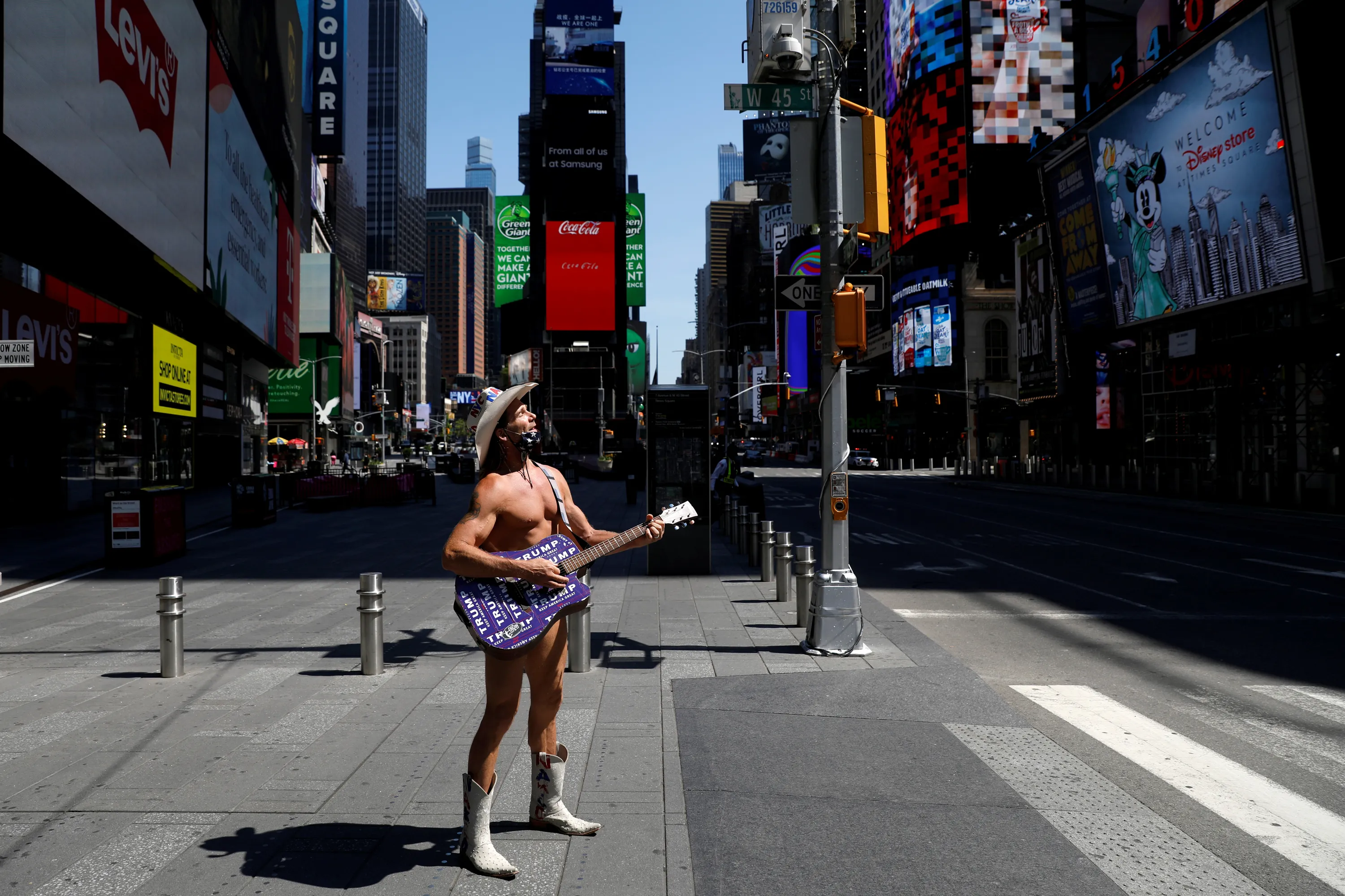 The Naked Cowboy stands alone in Times Square as Broadway theatres extended their closure due the outbreak of the coronavirus disease (COVID-19) in Manhattan, New York City, U.S., May 15, 2020. (Photo by Andrew Kelly/Reuters)
