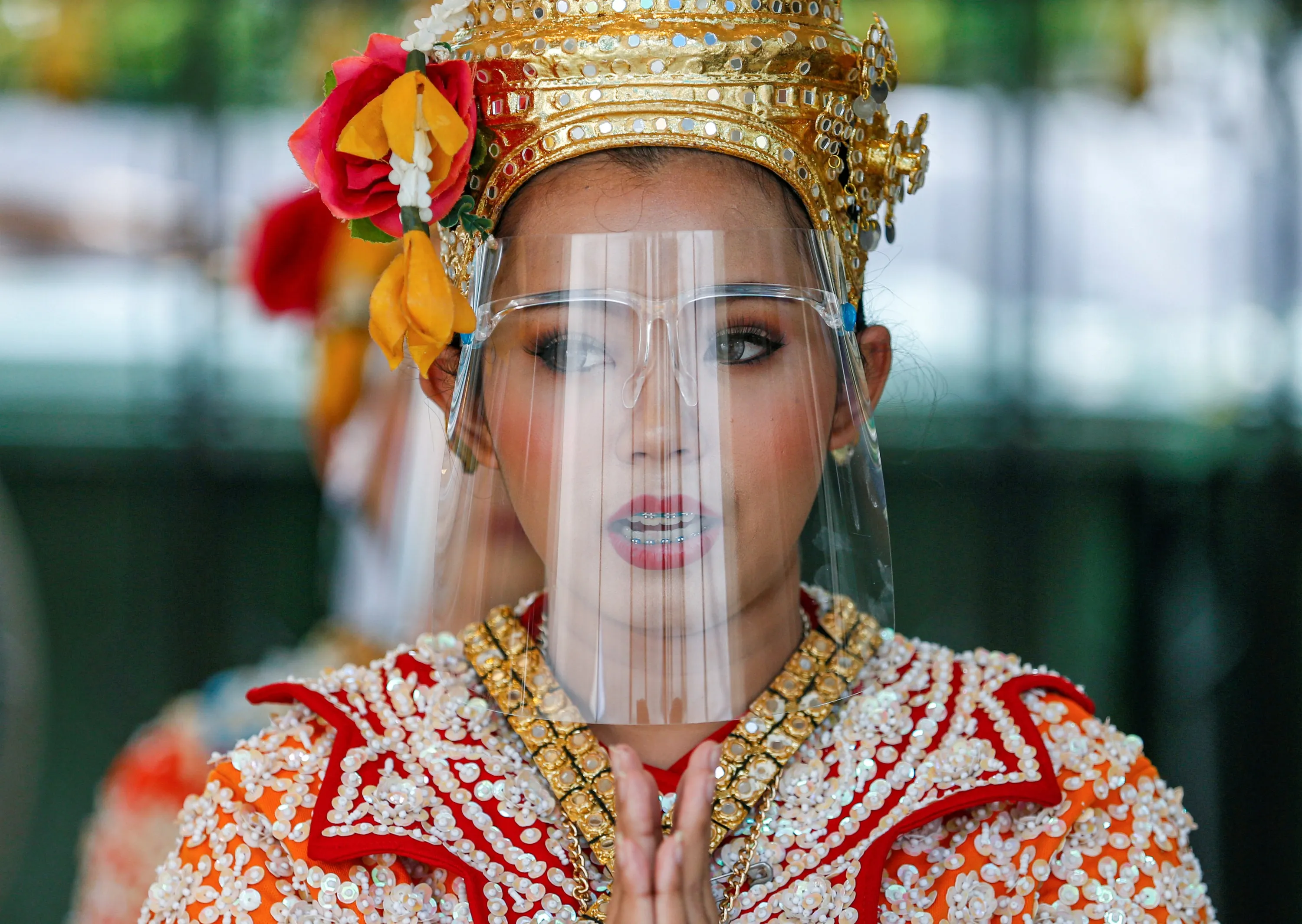 An artist wearing a protective face shield performs at the Erawan Shrine, after the government started opening some restaurants outside shopping malls, parks and barbershops during the coronavirus disease (COVID-19) outbreak in Bangkok, Thailand, May 4, 2020. (Photo by Soe Zeya Tun/Reuters)