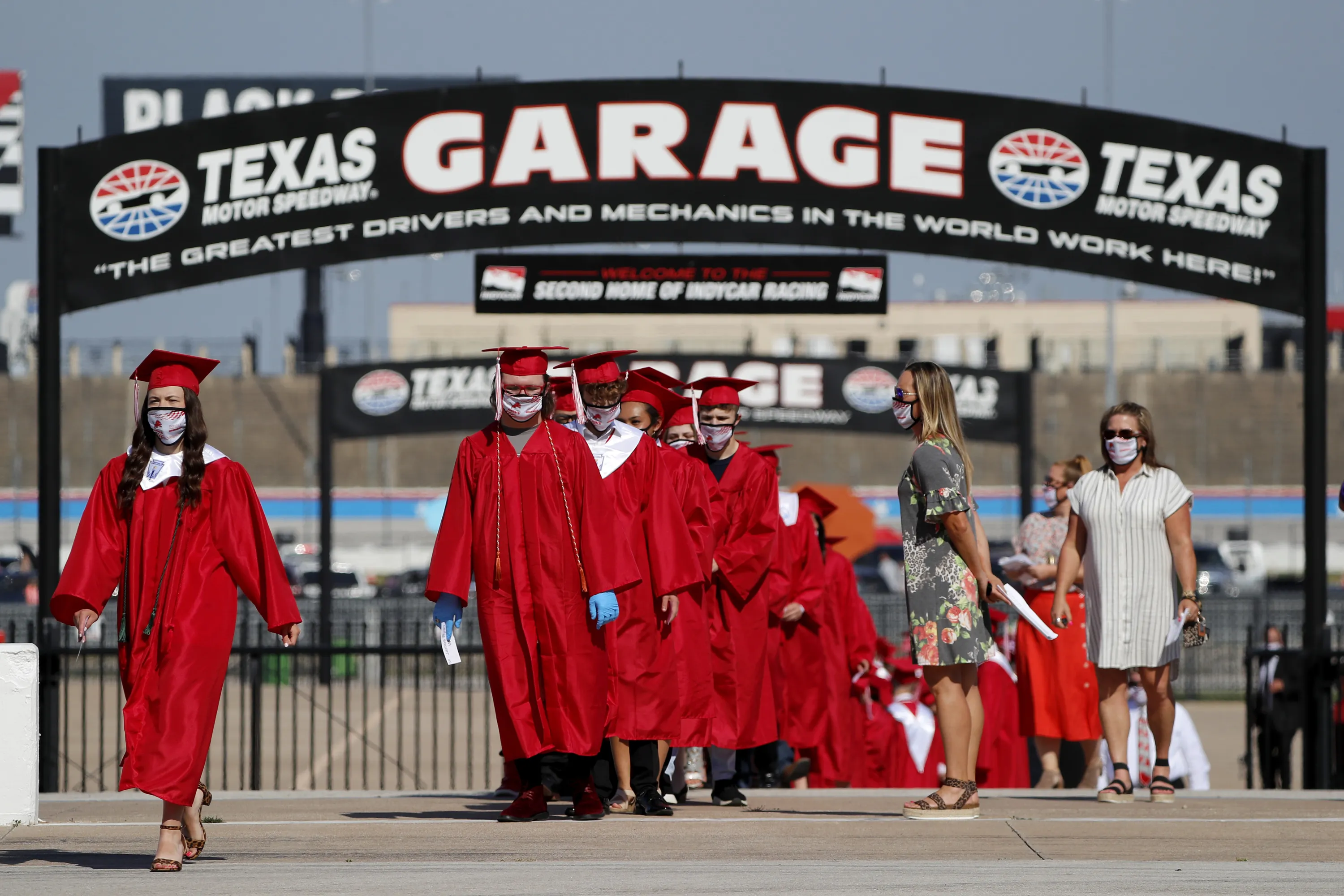 Ponder High School graduates march out of the garage area and onto the front stretch to participate in their graduation ceremony at Texas Motor Speedway in Fort Worth, Texas, Tuesday, May 19, 2020. Texas Motor Speedway is hosting 30 socially-distanced high school graduation ceremonies over the next few weeks. The first two were Monday night. Students receive their diplomas on the front stretch of the track with family and friends in their cars parked on the infield watching the ceremony on the track's massive “Big Hoss” TV screen. (Photo by Tony Gutierrez/AP Photo)