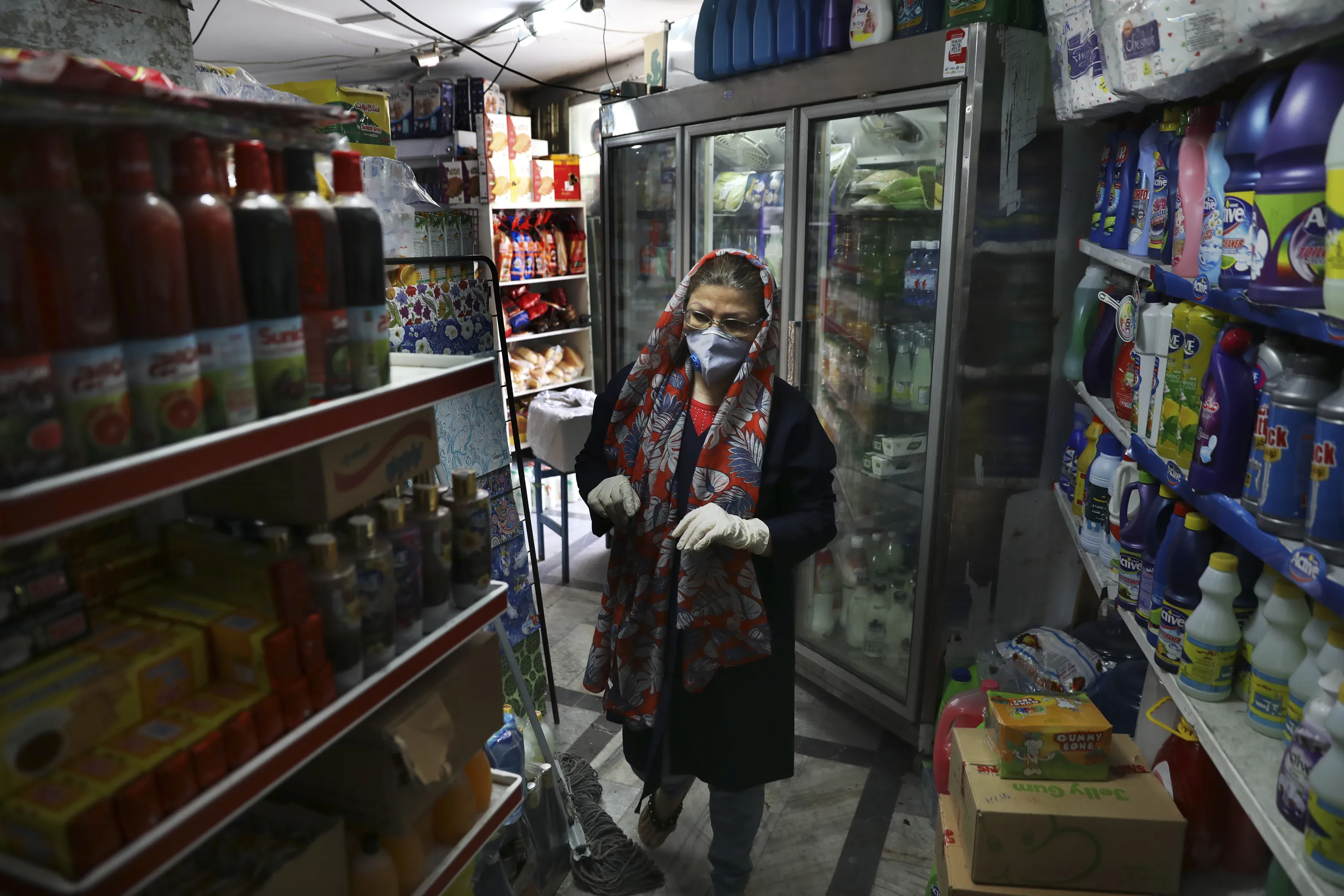 Customer Azar Arayesh, wearing a protective face mask and gloves to help prevent the spread of the coronavirus, shops in a grocery in Tehran, Iran, Tuesday, April 21, 2020. Iran is the region's epicenter of the COVID-19 pandemic, though even Iran's parliament suggests the death toll is nearly double that and overall cases remain vastly underreported. (Photo by Vahid Salemi/AP Photo)