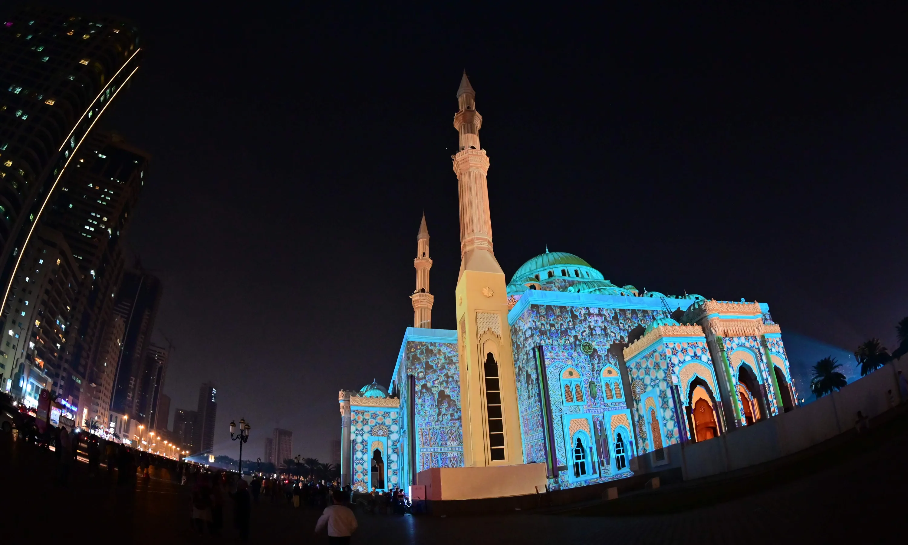Al-Noor Mosque is lit up in a colourful display for the 10th annual Sharjah Light Festival in the Emirate of Sharjah, on February 7, 2020. (Photo by Giuseppe Cacace/AFP Photo)