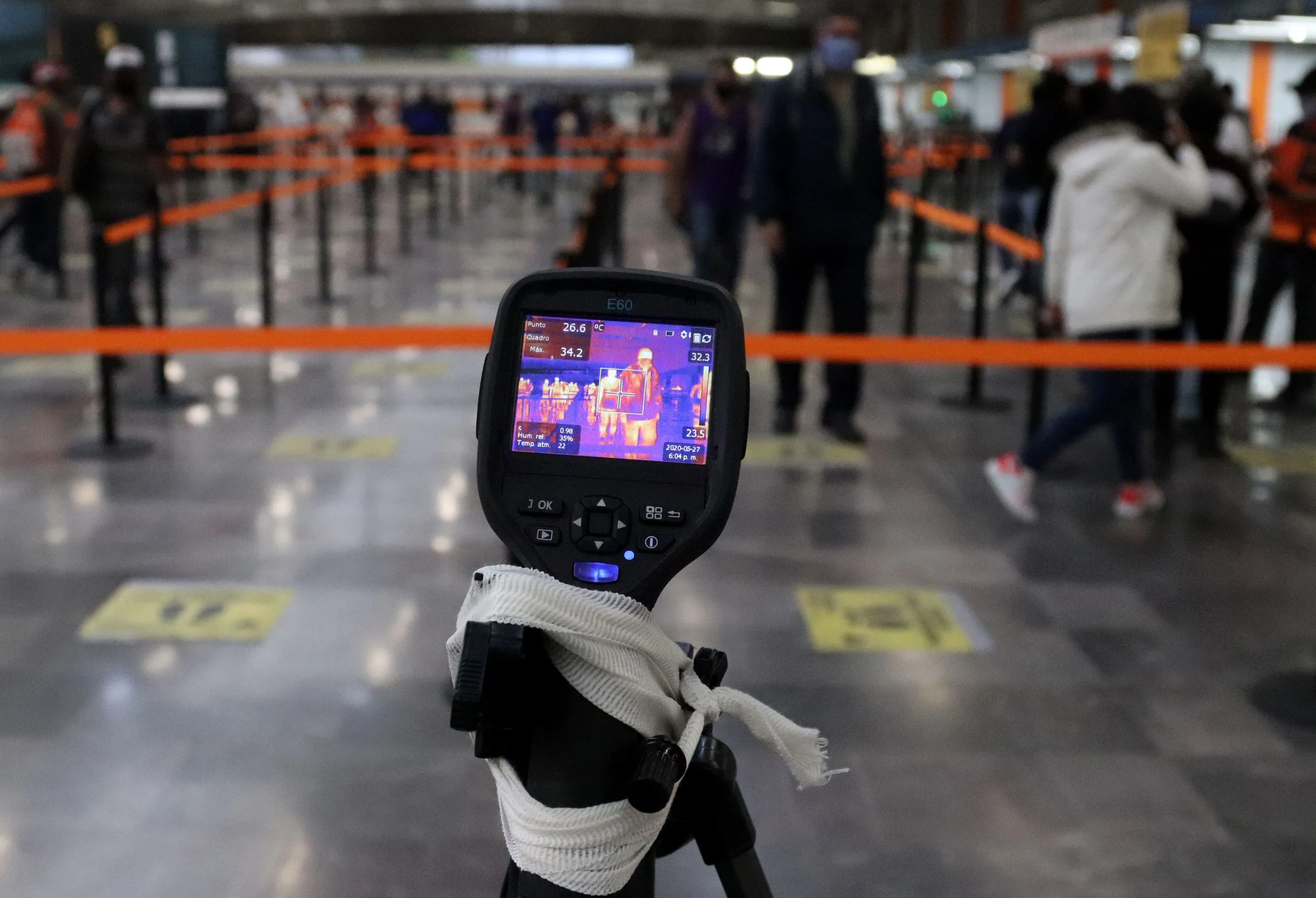 A thermal scanner checks commuters' temperature during the Metro Collective System's implementation of dosing measures, at the four-way station in Mexico City, Mexico 27 May 2020. The Mexican health authorities reported on 27 May an increase in coronavirus cases. (Photo by Jose Pazos/EPA/EFE/Rex Features/Shutterstock)