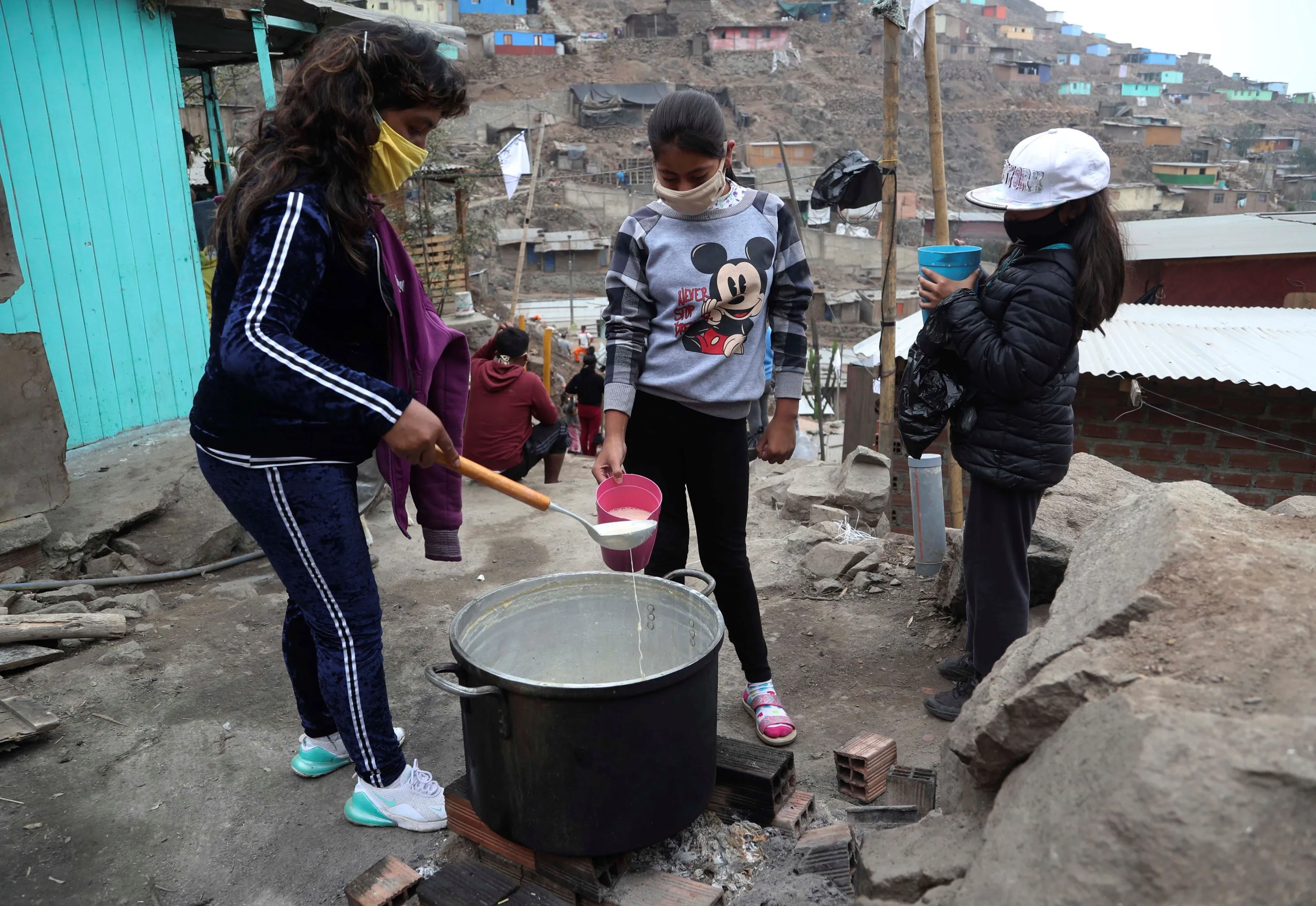 Wearing a mask against the spread of the new coronavirus, two girls receive a free breakfast of oatmeal to take home, from a soup kitchen at the Flor de Amancaes shantytown in Lima, Peru, Wednesday, May 27, 2020. Despite strict measures to control the new coronavirus pandemic, this South American nation of 32 million has become one of the countries worst hit by COVID-19. (Photo by Martin Mejia/AP Photo)