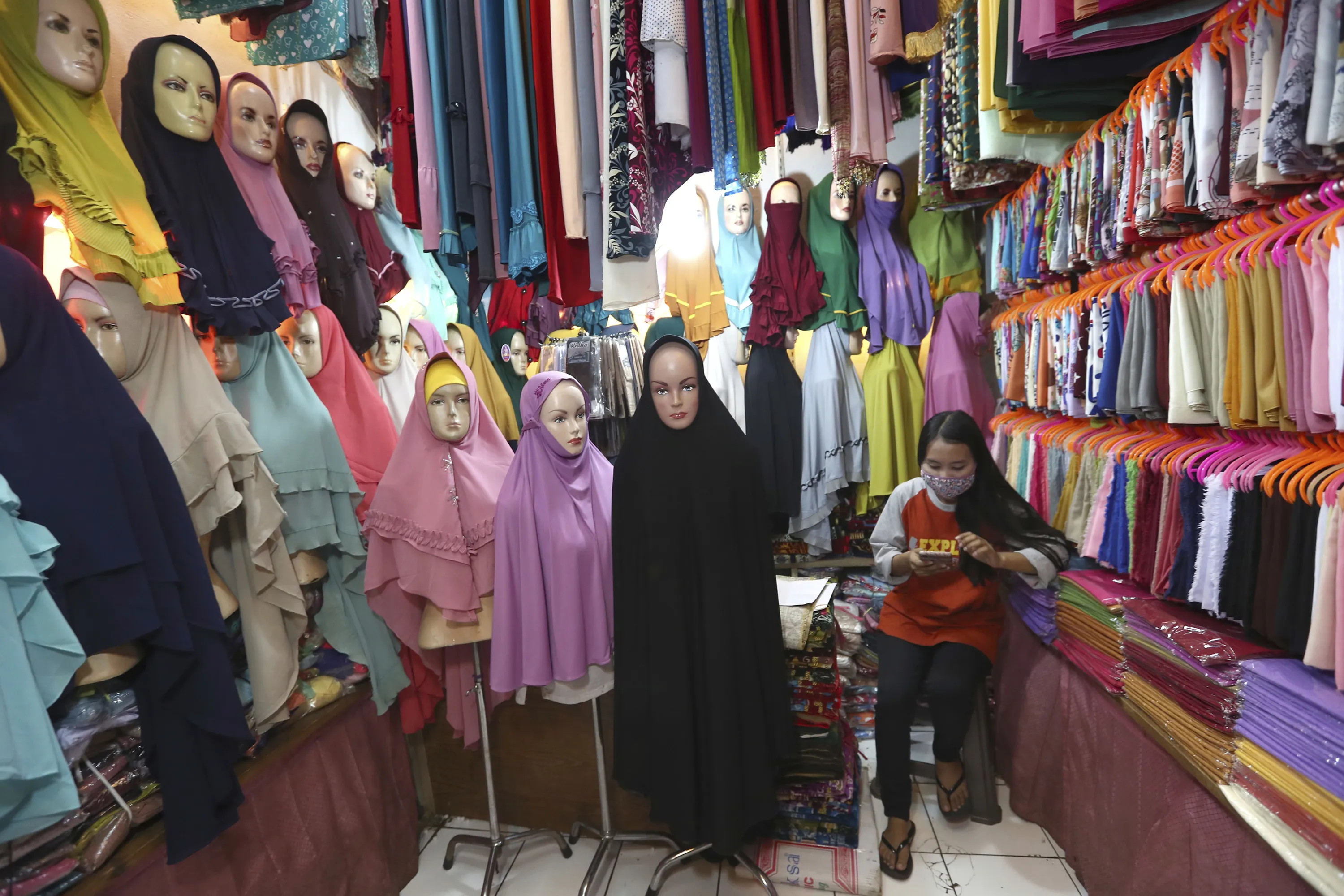 A head scarf vendor wearing a face mask waits for customers at a traditional market in Tangerang, Indonesia, Saturday, May 9, 2020. (Photo by Tatan Syuflana/AP Photo)