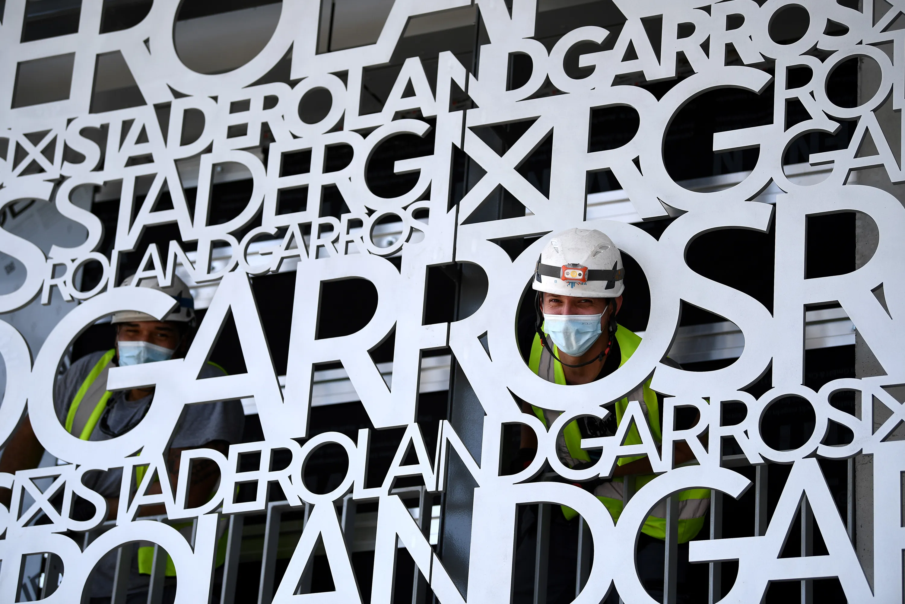 Workers wearing protective facemasks react on the construction site of the Philippe Chatrier central tennis court and of its newly built roof, at the Roland Garros stadium, in Paris on May 27, 2020. The Roland Garros 2020 French Open tennis tournament should have started on May 24, 2020, instead, it will be held between September 20 and October 4, 2020 due to the COVID-19 pandemic. (Photo by Franck Fife/AFP Photo)