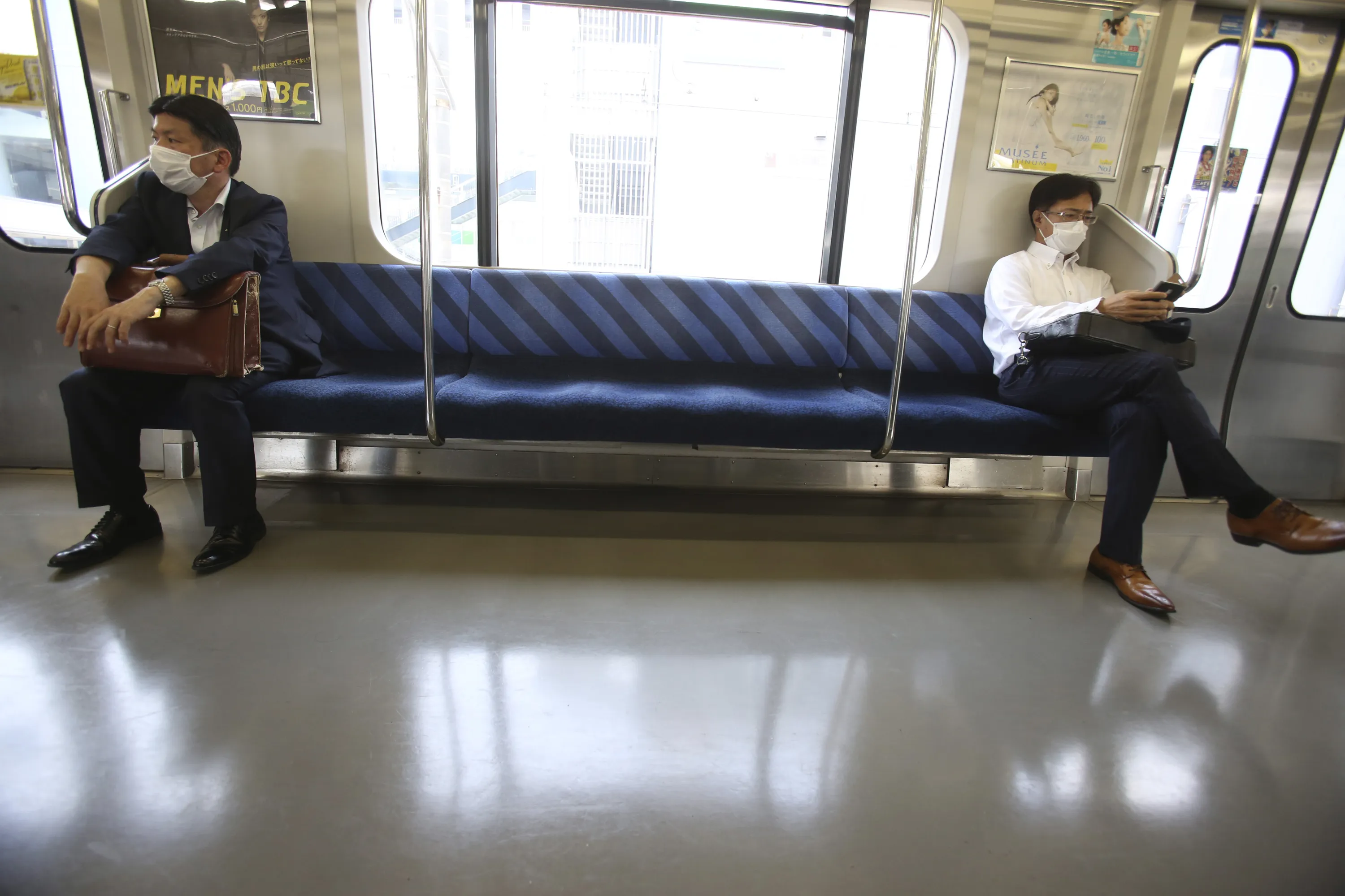 People wearing face masks to protect against the spread of the new coronavirus keep social distancing in a train in Yokohama, near Tokyo, Thursday May 28, 2020. Japanese Prime Minister Shinzo Abe lifted a coronavirus state of emergency on Monday, ending the restrictions nationwide as businesses begin to reopen. (Photo by Koji Sasahara/AP Photo)