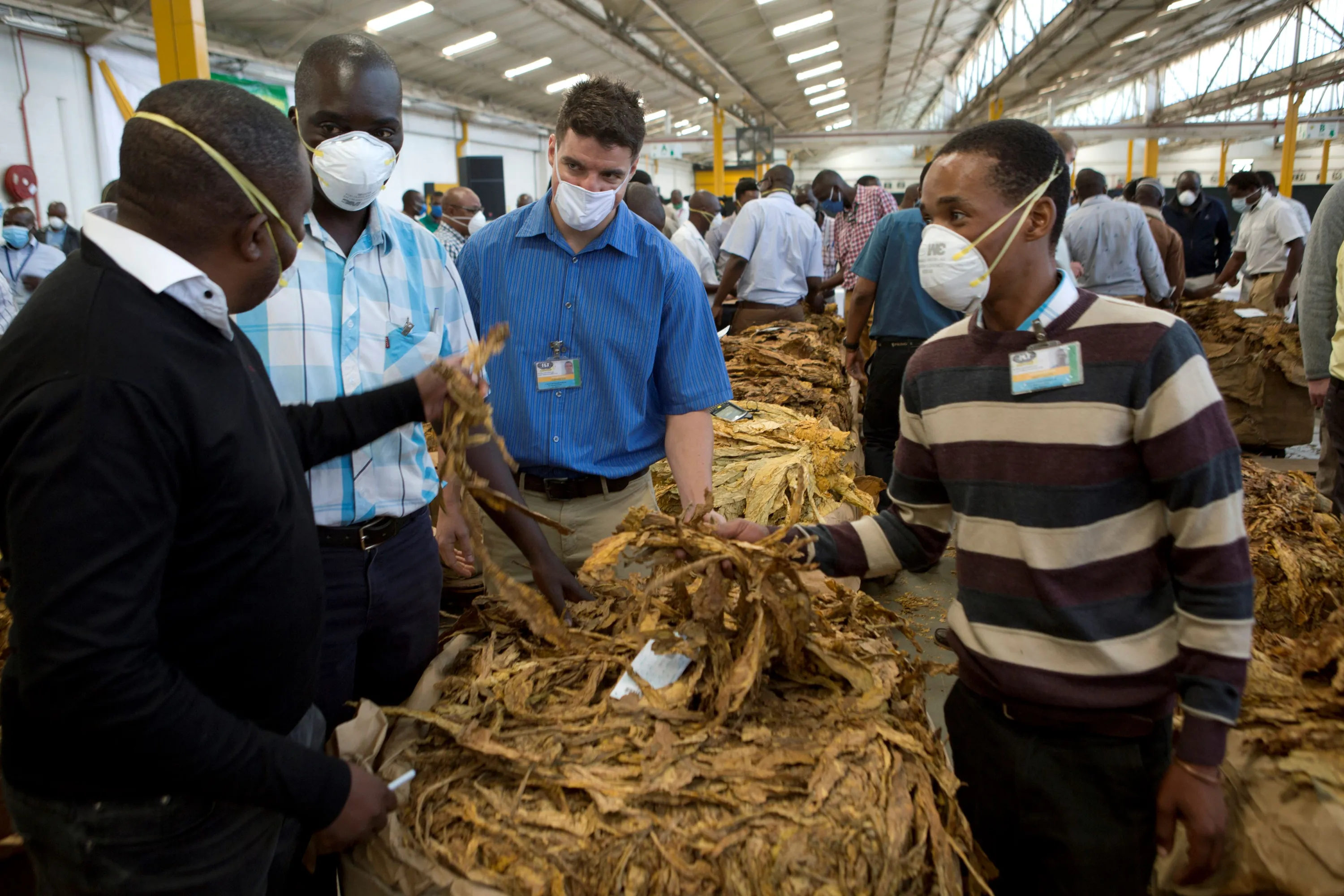 Tobacco auctioneers wear face masks to protect against coronavirus while inspecting crop on the first day of the tobacco marketing season in Harare, Zimbabwe, Wednesday, April 29, 2020. The tobacco selling season began across the country with auction floors complying with strict Covid-19 measures which included setting up clinics and isolation sites. (Photo by Tsvangirayi Mukwazhi)/AP Photo