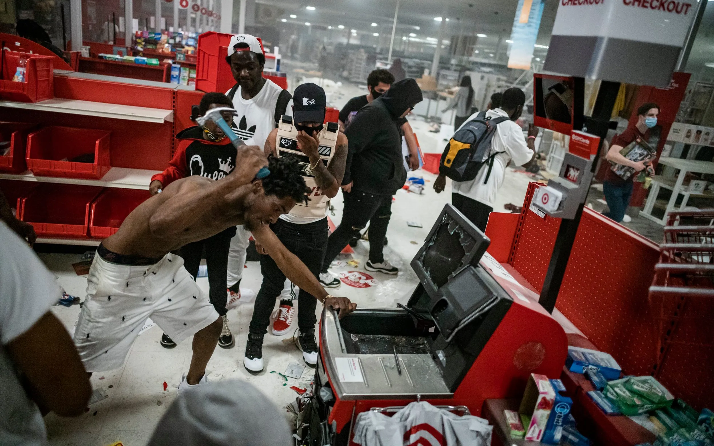 In this Wednesday, May 27, 2020 photo, a looter uses a claw hammer as he tries to break in to a cash register at a Target store in Minneapolis. Rioters ignited fires and looted stores all over the city, as peaceful protests turned increasingly violent in the aftermath of the death of George Floyd. (Photo by Richard Tsong-Taatarii/Star Tribune via AP Photo)