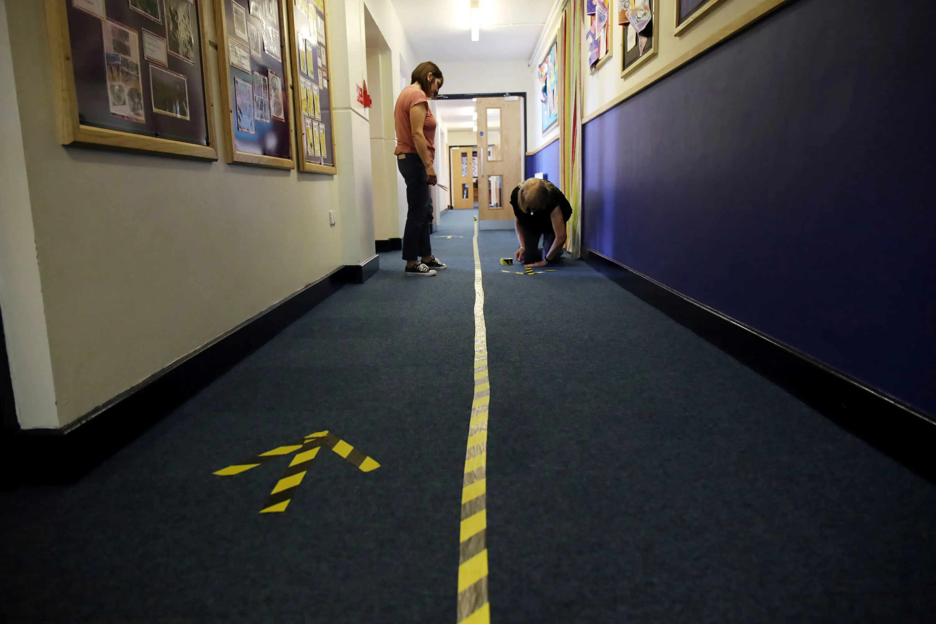 Staff put social distancing markings on the floor at Barnton community primary school, following the outbreak of the coronavirus disease (COVID-19), Northwich, Britain, May 28, 2020. (Photo by Molly Darlington/Reuters)