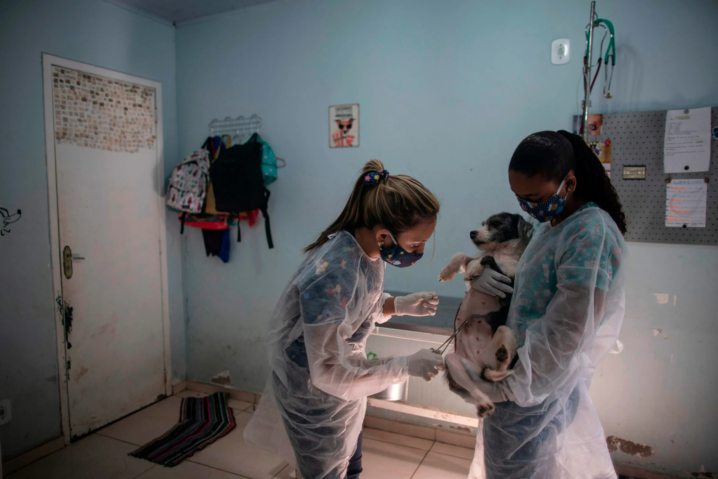 Veterinarians check a dog before its is taken to its new home at the Public Animal Shelter of the Guaratiba neighborhood, in Rio de Janeiro, Brazil, on May 28, 2020, during the coronavirus pandemic. Rio de Janeiro's Public Animal Shelter launched the program “Pet Delivery” to facilitate the adoption of pets during the coronavirus pandemic amid the stay-at-home order in the city of Rio de Janeiro to attend a rising search of pets. People searching a new friend can easily check pets' profiles through social-media webpages of the shelter and have the animal delivered to their home for free. (Photo by Mauro Pimentel/AFP Photo)