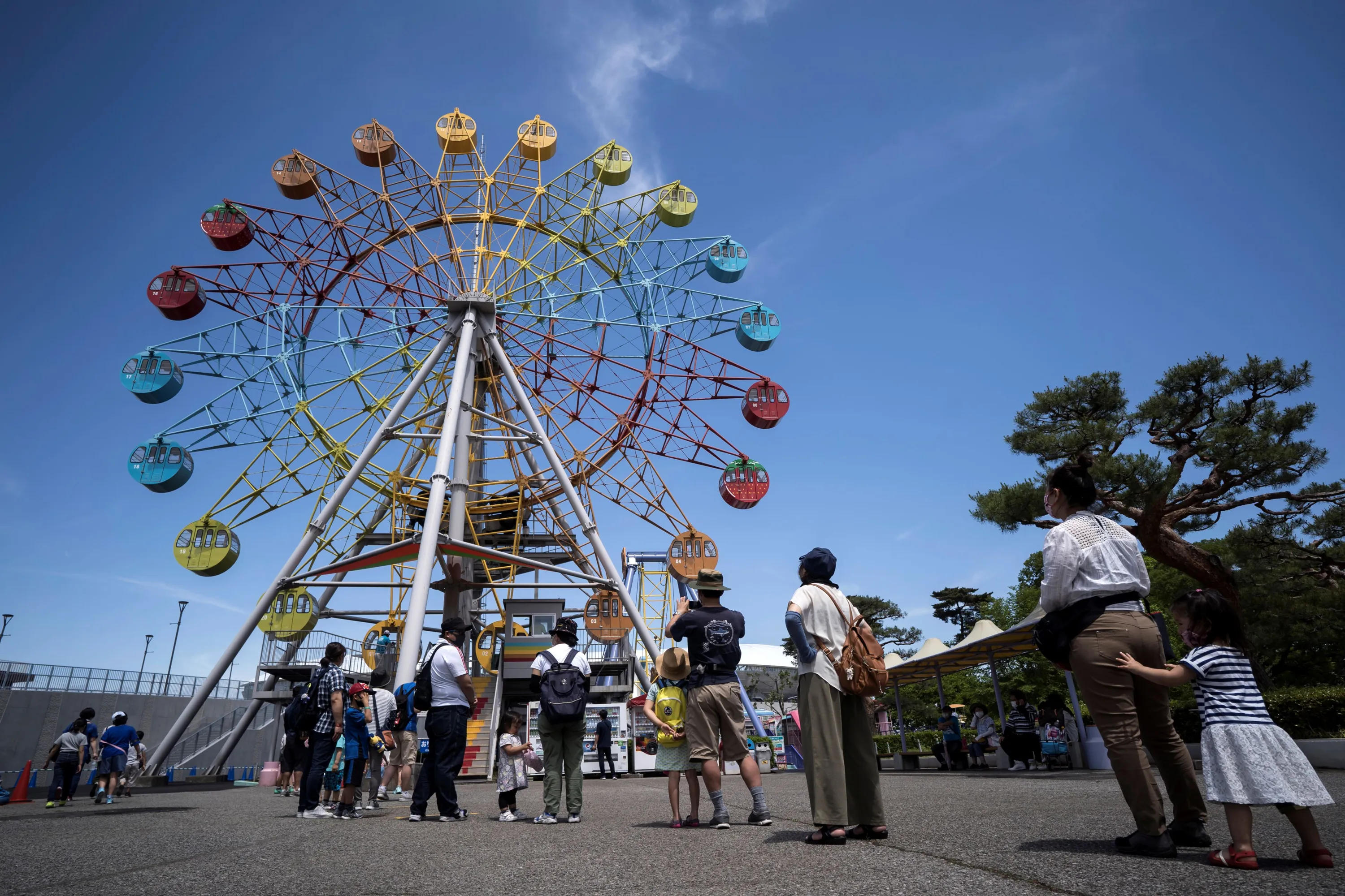 Visitors wait in line to ride the ferris wheel at the Tochinoki Family Land amusement park on May 17, 2020 in Utsunomiya, Tochigi, Japan. Japan's Prime Minister Shinzo Abe announced on May 14 that the nationwide state of emergency has been lifted for 39 of the country's 47 prefectures after the number of new Covid-19 coronavirus cases decreased. However, Hokkaido, Tokyo, Kanagawa, Saitama, Chiba, Osaka, Kyoto and Hyogo will remain under the order until May 31. (Photo by Tomohiro Ohsumi/Getty Images)