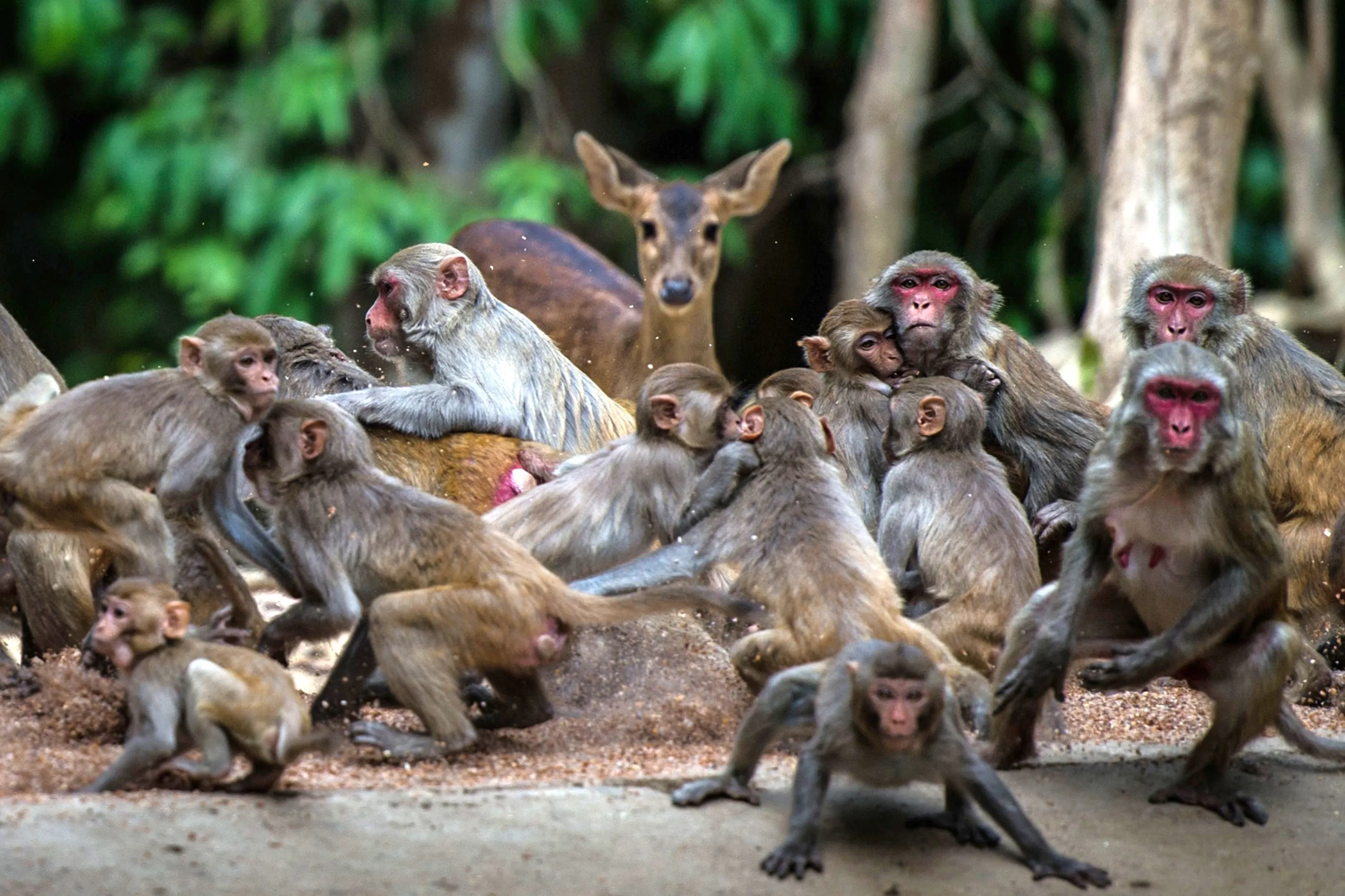 This photo taken on May 17, 2020 shows monkeys scrambling for food during feeding time by rangers at the Hlawga Wildlife Park, outskirts of Yangon that remains closed, amid the concerns of the COVID-19 coronavirus pandemic. Hlawga Park attracts large visitor each months awaiting for reopening with restrictions as preventive measures against coronavirus. (Photo by Ye Aung Thu/AFP Photo)