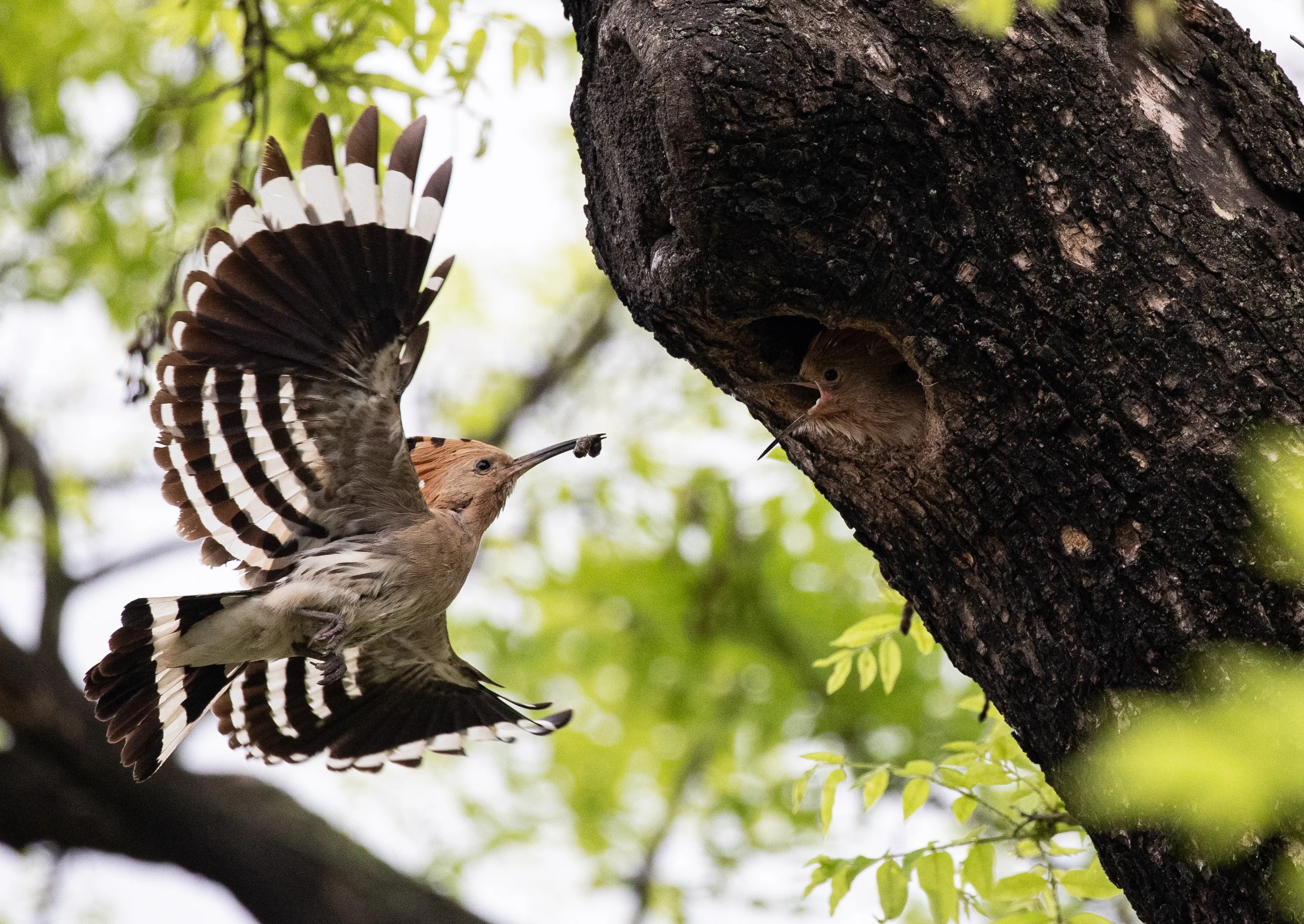 A view of a Eurasian hoopoe (Upupa epops) bird captured in flight while feeding its chicks at the entrance of their hole-nest in a tree, in Ilsan city, Gyeonggi province, South Korea, 16 May 2020. (Photo by Jeon Heon-kyun/EPA/EFE)